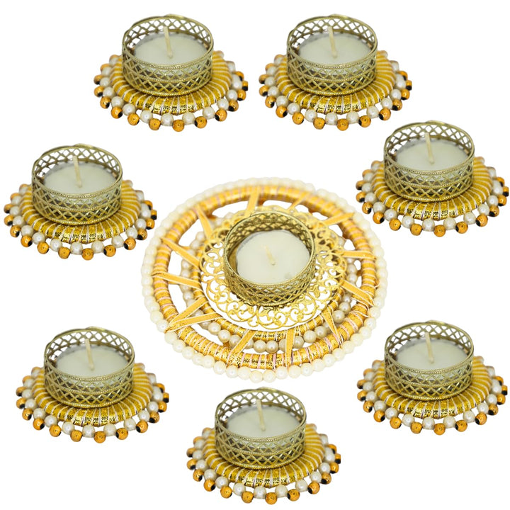 8-Piece Festival Tealight Holder Combo | 7 Gold & White Pearl Bangle Holders & 1 Sunshine Pearl Holder with Tea Light Candles for Diwali, Weddings & Pooja