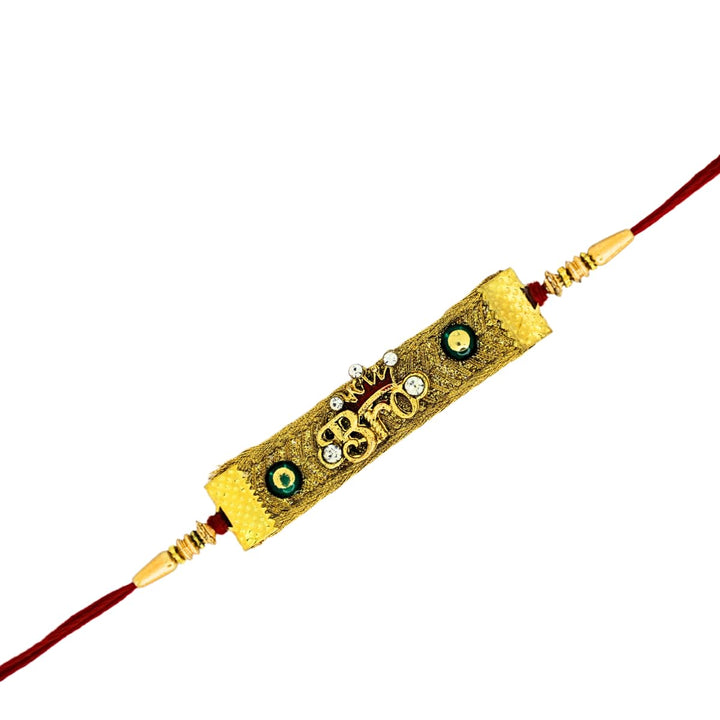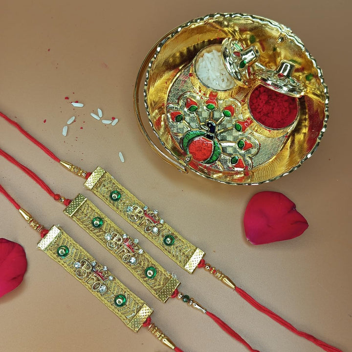 - Stylish BRO Rakhi – Features a golden Rakhi with the word "BRO" embellished with stones and bead detailing—perfect for your modern bhai.