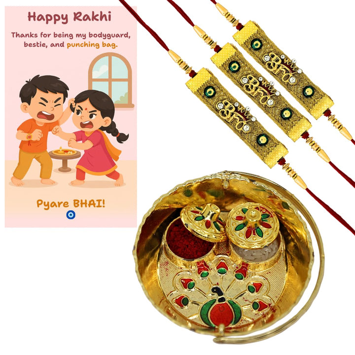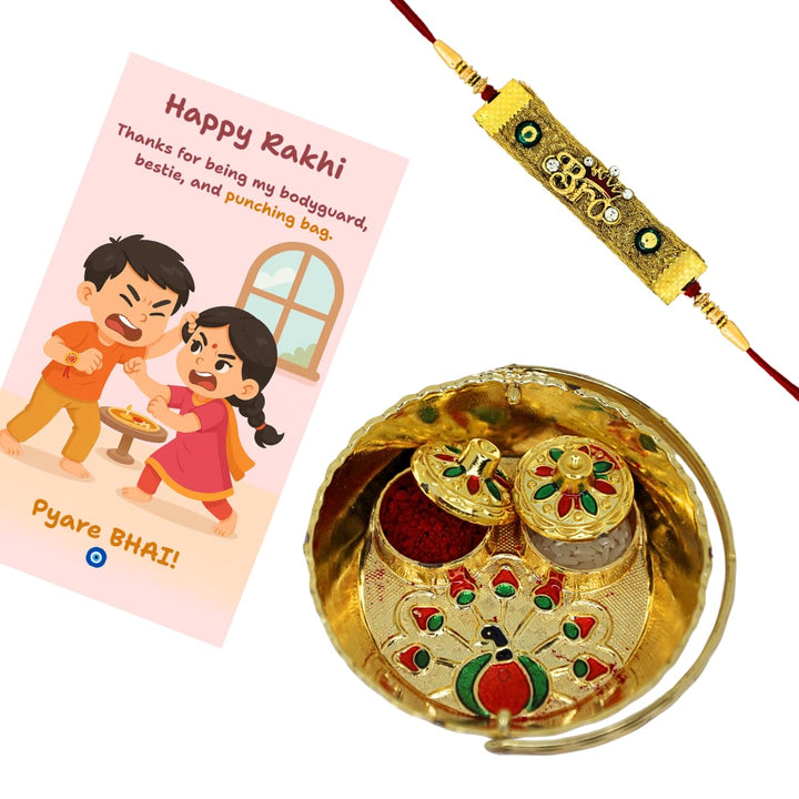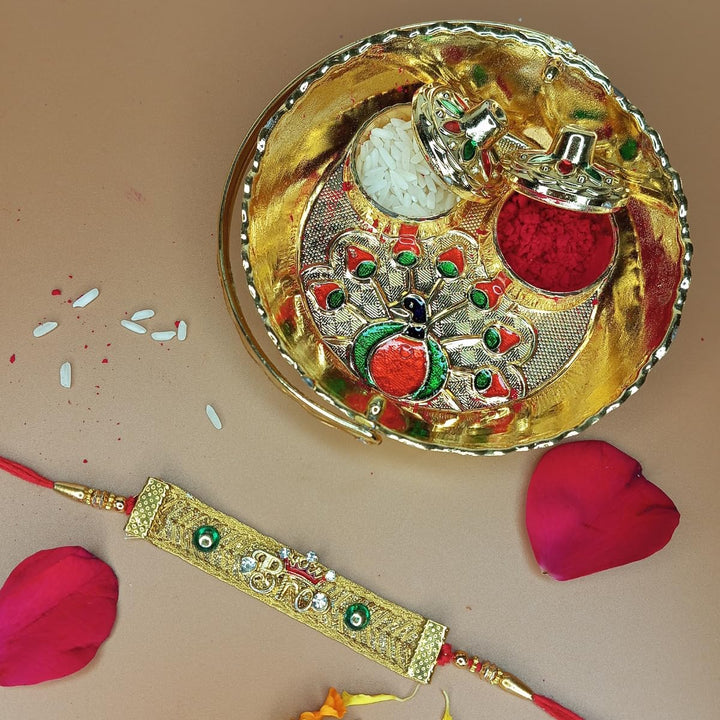 BRO Rakhi with Roli Kumkum, Quirky Card & 10cm Decorative Pooja Thali | Raksha Bandhan Gift Combo for Brother | Rakhi Thali Set for Bhai