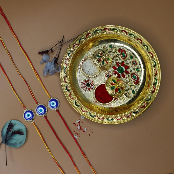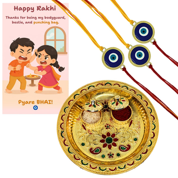 Classic Evil Eye Rakhi with Funny Card,kumkum & Decorative Pooja Thali (14cm)| Raksha Bandhan Gift Combo for Brother | Nazar Rakhi with Quirky Card