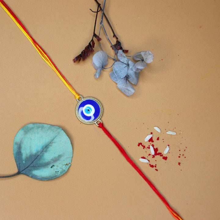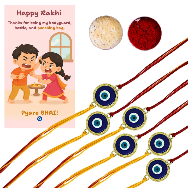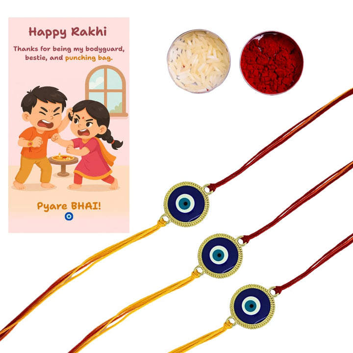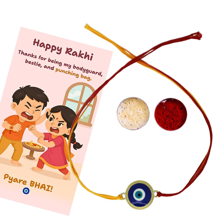 Classic Evil Eye Rakhi with Funny Card, Roli & Chawal | Raksha Bandhan Gift Combo for Brother | Nazar Rakhi with Quirky Card