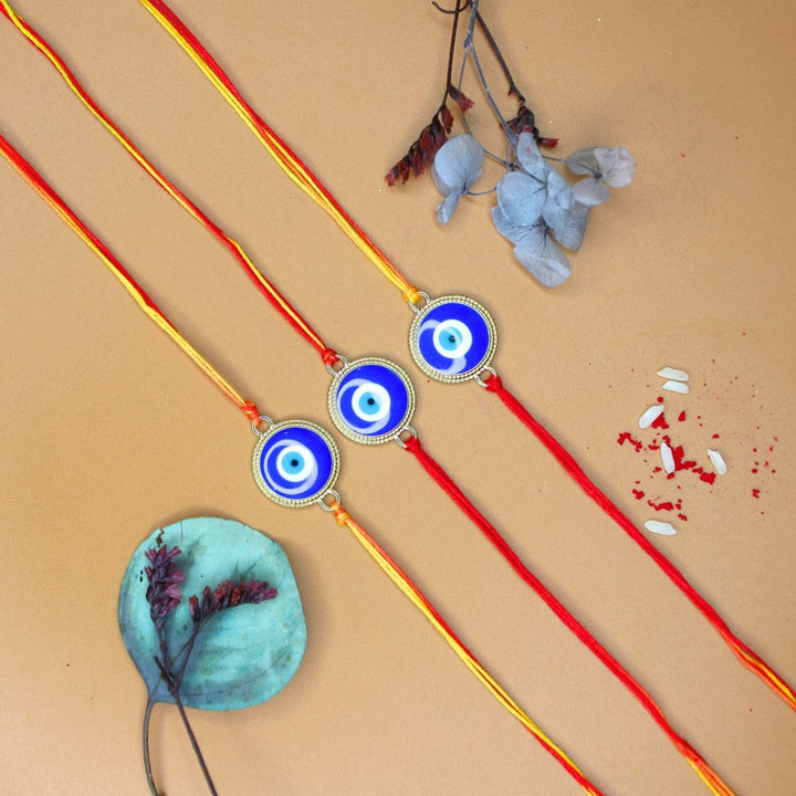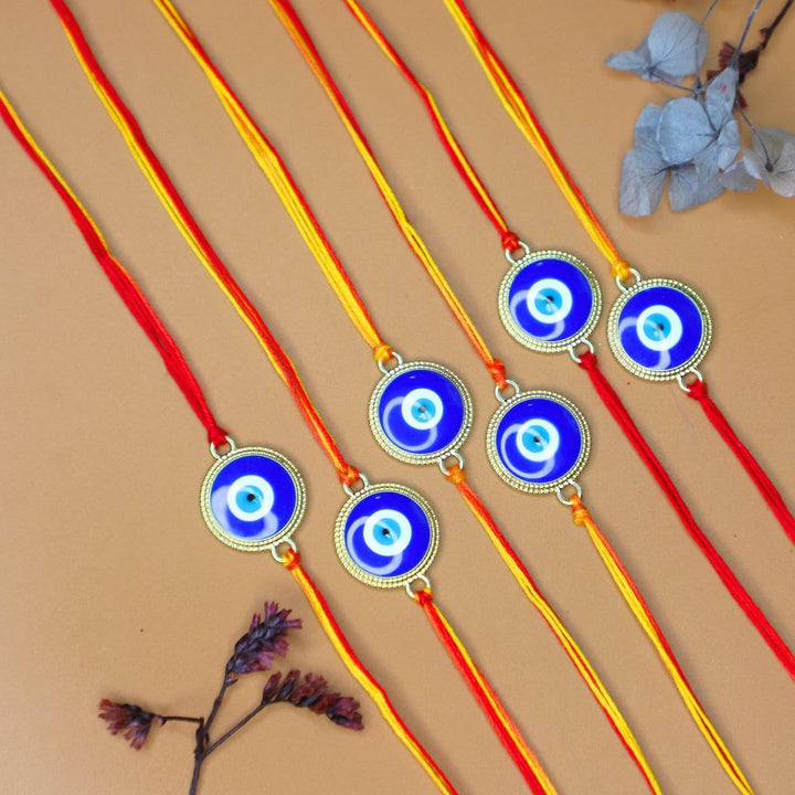 - Protective Evil Eye Rakhi – Features a bold navy blue evil eye charm on a red-yellow thread, symbolizing protection from negative energy.