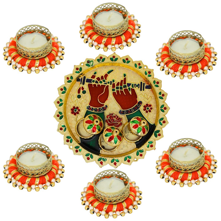 Divine Krishna Pooja Set | 7 Orange Bangle with Gold Pearl Holders & 1 Flute Harmony Thali with Tea Light Candles | Decorative Festive Tealight Holder Set for Pooja & Diwali