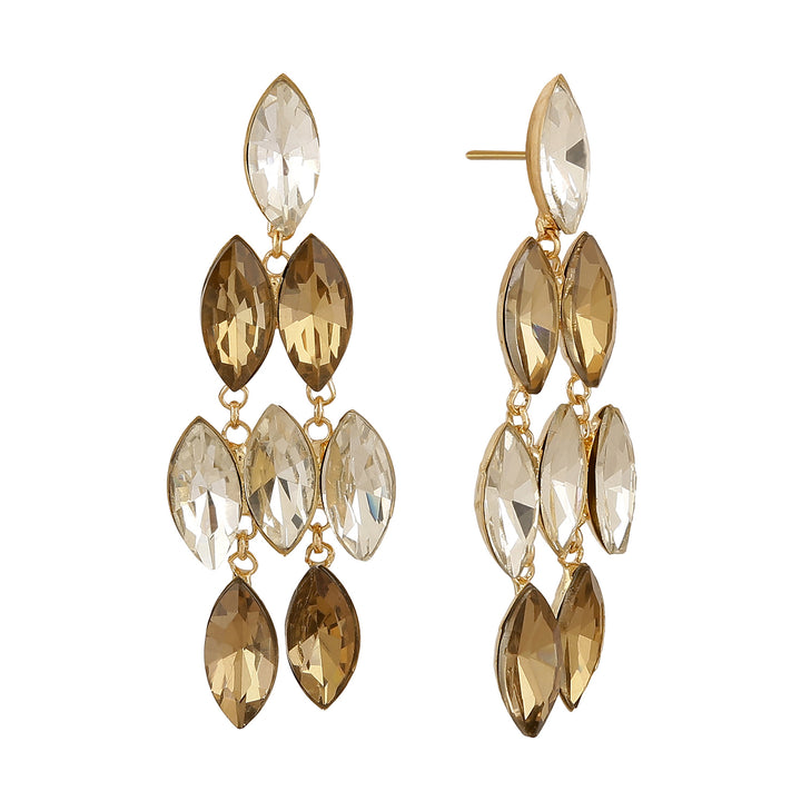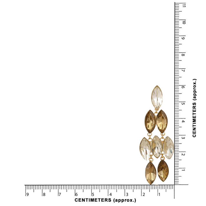 Make a dazzling statement with these Gold & Champagne Crystal Chandelier Earrings, designed to add a touch of sophistication and luxury to your look. Featuring cascading layers of marquise-cut champagne and clear crystals, these earrings radiate elegance with every movement. The lightweight design ensures comfortable wear, while the shimmering gold-tone finish enhances their timeless appeal. Perfect for weddings, festive occasions, cocktail parties, and evening events, these earrings are the ultimate accessory for women who love refined glamour.