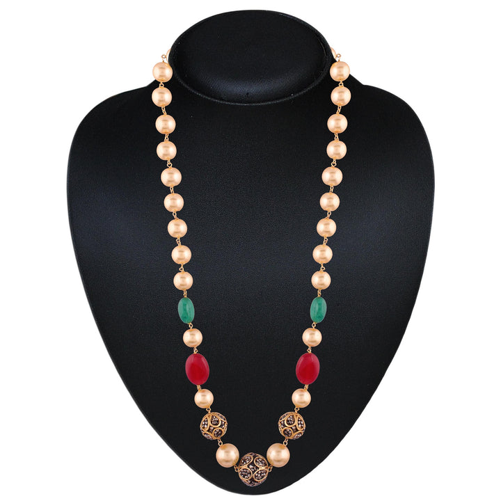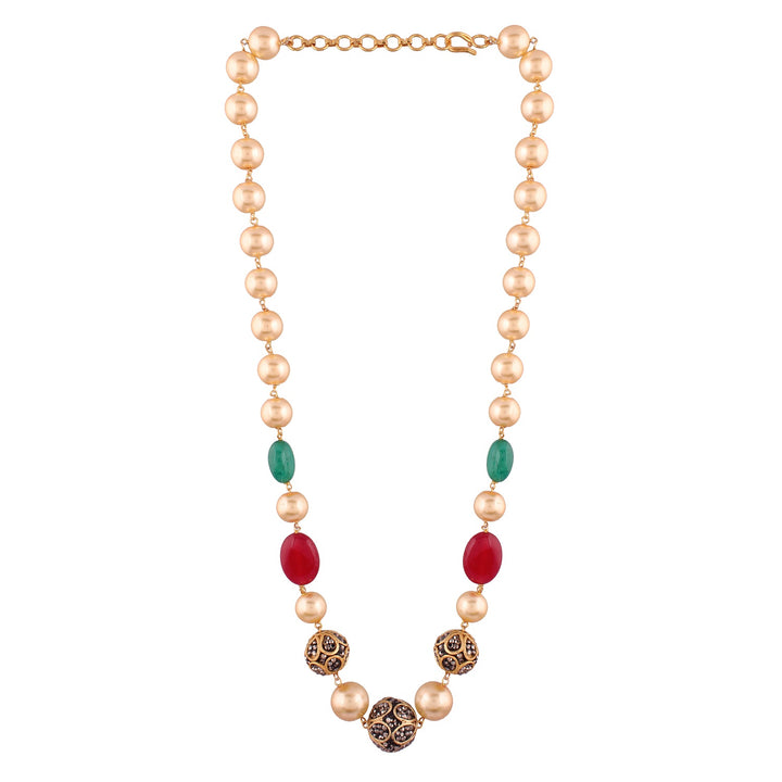 Elegant Gold Pearl Necklace with Red and Green Beads and Ant