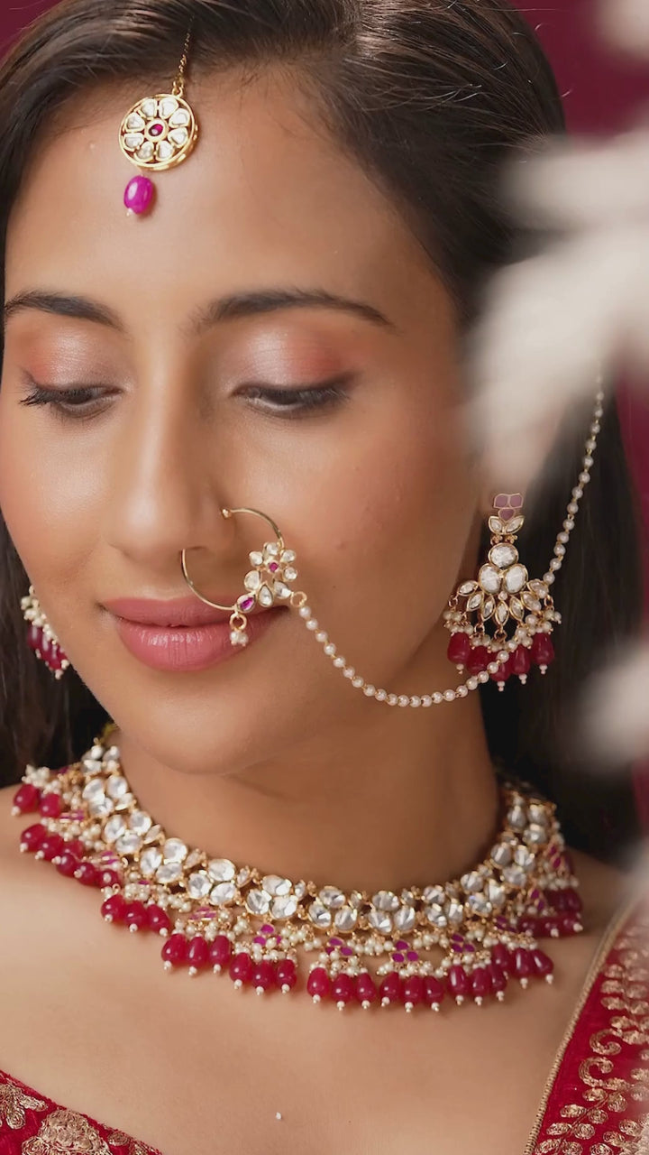 Enhance your elegance with this stunning Kundan necklace and earrings set, intricately designed to blend tradition with timeless beauty. The necklace features brilliant Kundan stones, set in a gold-plated base, adorned with rich ruby red drops that add a pop of color and sophistication. The matching earrings perfectly complement the necklace, creating a cohesive and luxurious look. Whether for a wedding, festive occasion, or special event, this jewelry set is sure to make you stand out.