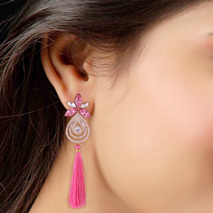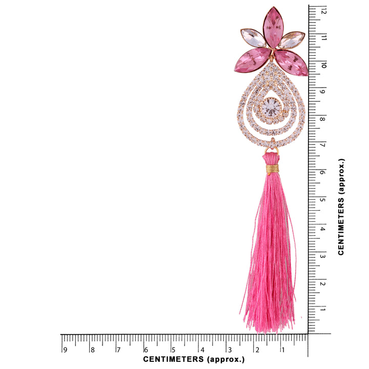 Make a bold fashion statement with these stunning Pink Crystal & Tassel Earrings. Featuring a dazzling floral-inspired crystal stud, a teardrop-shaped rhinestone setting, and long silky pink tassels, these earrings exude elegance and charm. The shimmering crystals and gold-tone finish add a luxurious touch, making them the perfect accessory for weddings, festive occasions, and evening parties. Lightweight and stylish, these earrings will effortlessly elevate your look with a touch of glamour and sophistication.