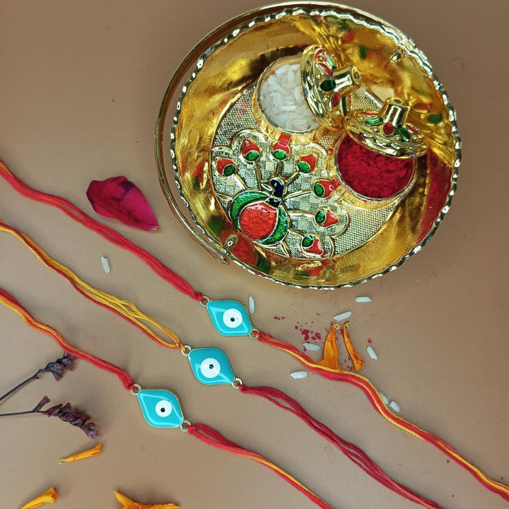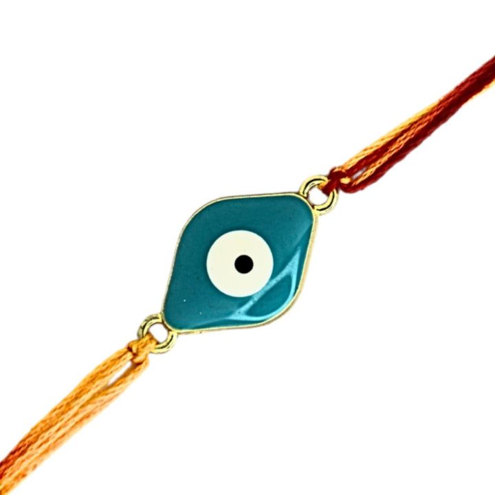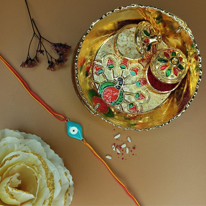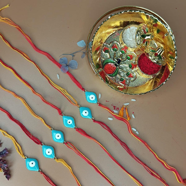 - Evil Eye Rakhi for Protection – Handcrafted Rakhi featuring a stylish turquoise evil eye charm on red-yellow thread to ward off negativity.