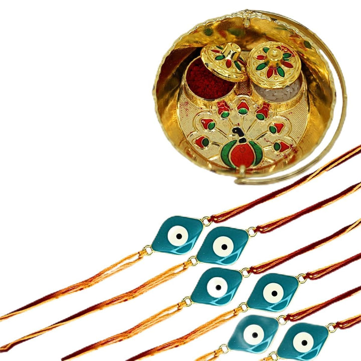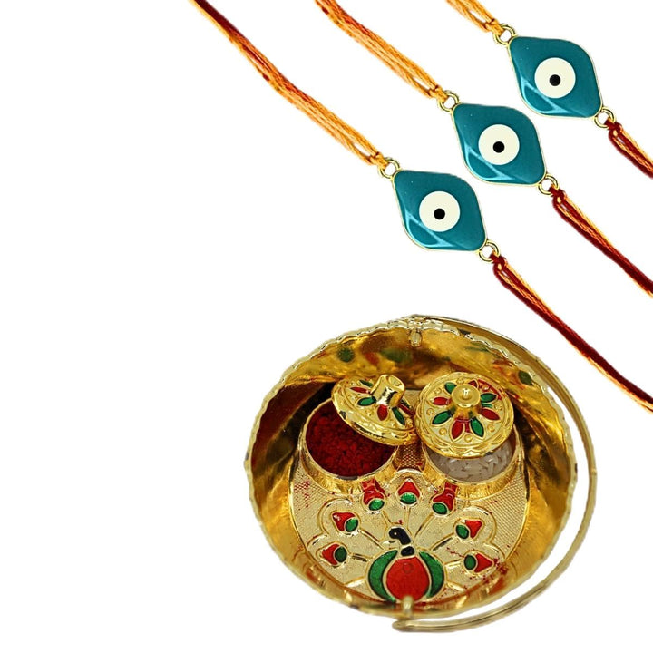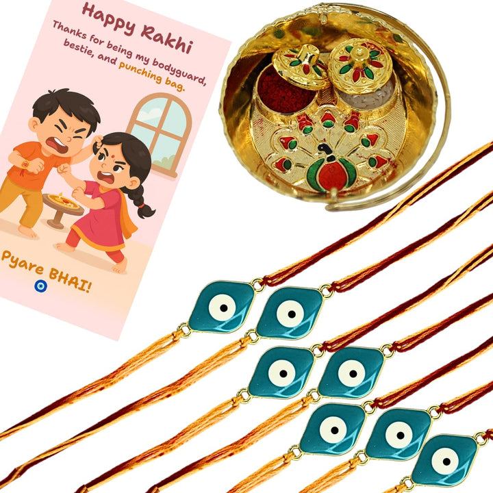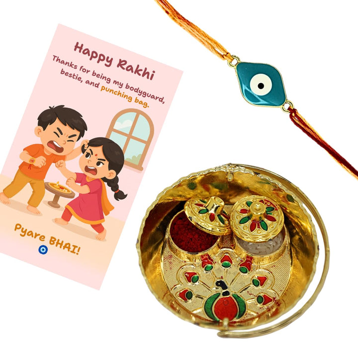 Evil Eye Rakhi with Roli Kumkum, Funny Raksha Bandhan Card & Decorative Pooja Thali (10cm) | Rakhi Combo Gift Set for Brother