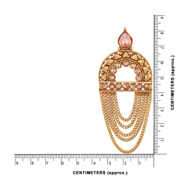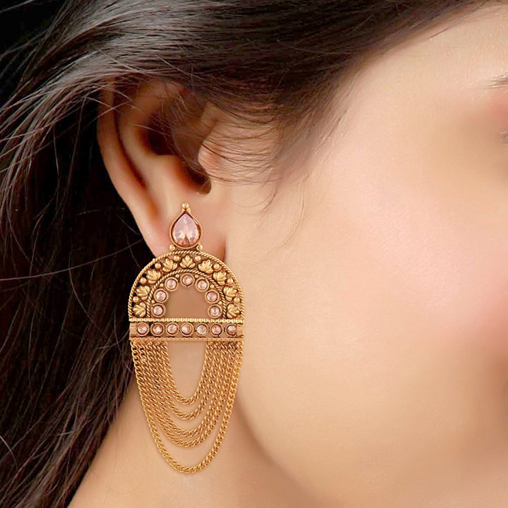 Elevate your style with these show-stopping gold-plated earrings, featuring an intricately carved arch design adorned with delicate pink crystal accents. The lightweight construction ensures comfortable wear, while the cascading multi-layer chain tassels add a regal, eye-catching movement to every step. Whether paired with a traditional ensemble or dressed up with contemporary attire, these statement earrings are the perfect finishing touch for weddings, parties, or any special occasion.