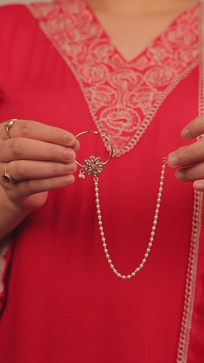 Description: Elevate your traditional jewelry collection with this exquisite Gold-Plated Delicate Nose Ring with Chain. Featuring a beautifully crafted floral design embellished with sparkling stones, this nose ring adds a touch of elegance and sophistication to any ethnic outfit. The attached chain adorned with delicate beads further enhances its charm, making it perfect for weddings, festivals, and special occasions.