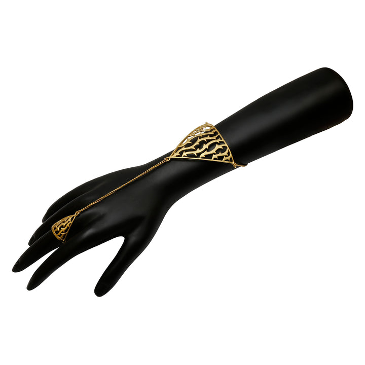 Description: Discover the beauty of intricate design with our Gold-Plated Filigree Haathphool with Ring. This elegant accessory set features delicate filigree work, showcasing a stunning gold-plated finish that adds a touch of sophistication to any outfit. Perfect for weddings, festivals, or special occasions, the haathphool and matching ring set offer a harmonious blend of traditional charm and modern elegance. Elevate your look with this timeless piece that exudes grace and style.