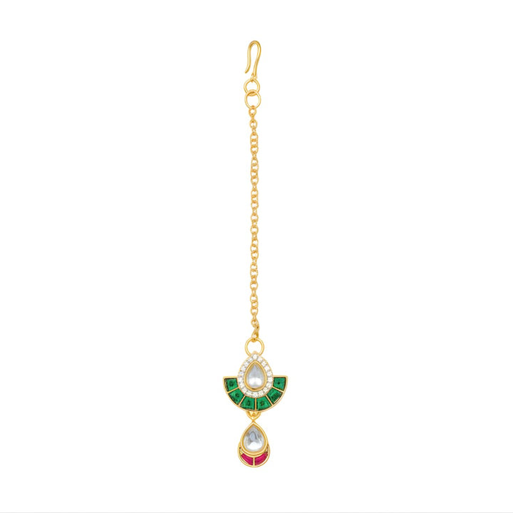 Gold Plated Kundan Maang Tikka for Women & Girls | Green & Pink Stone Traditional Hair Accessory for Wedding, Festive & Ethnic Wear