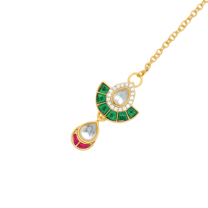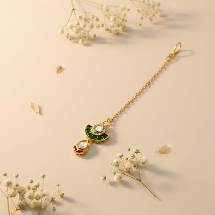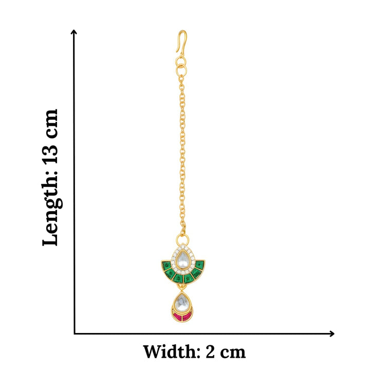 Add a touch of elegance to your ethnic look with this beautifully crafted Kundan Maang Tikka featuring a unique design embellished with green and pink stones. Made with premium gold plating and high-quality kundan stones, this lightweight hair accessory enhances any traditional hairstyle effortlessly. The eye-catching dual-tone colour palette makes it perfect for festive occasions, weddings, haldi, mehendi, sangeet and cultural celebrations.Designed for comfort and easy wear, the tikka comes with a secure hook that ensures a firm grip on the hair without slipping. Pair it with lehengas, sarees, anarkalis or Indo-fusion outfits to complete your festive or bridal ensemble. A stunning accessory to add grace, charm and a royal touch to your appearance, and a thoughtful gift for women and girls who love ethnic jewellery.