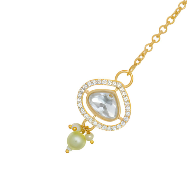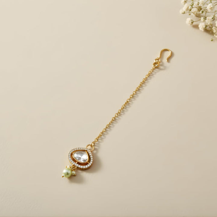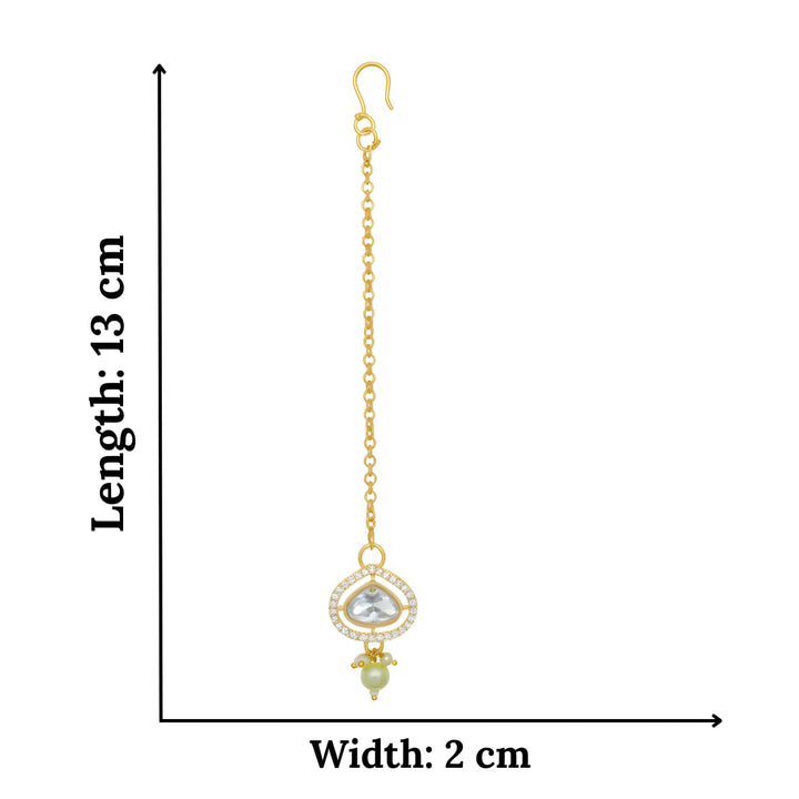 Add a touch of elegance to your ethnic look with this beautifully crafted Gold Plated Kundan Maang Tikka. Designed with a delicate pear-shaped kundan stone surrounded by shimmering crystals and finished with a dainty pearl drop, this tikka brings out a refined and graceful charm. Its lightweight and comfortable fit make it perfect for long hours of wear during weddings, festive celebrations, family functions and traditional events.The tikka features a secure hook for easy attachment, ensuring it stays in place throughout the occasion. Pair it effortlessly with lehengas, sarees, shararas, anarkalis or Indo-fusion outfits to complete your traditional ensemble. A must-have accessory for brides, bridesmaids and ethnic jewellery lovers, and a thoughtful gifting choice too.