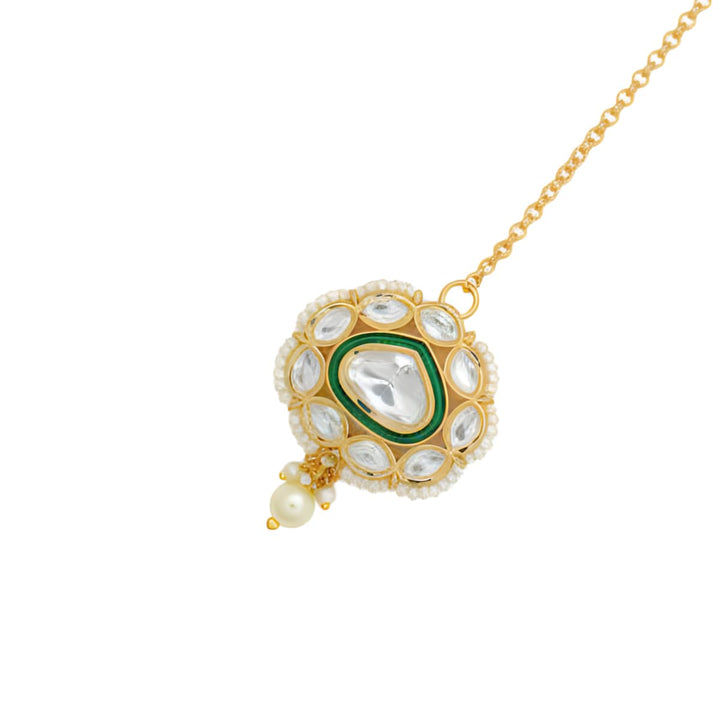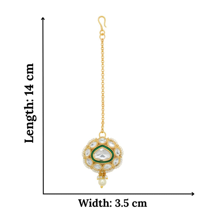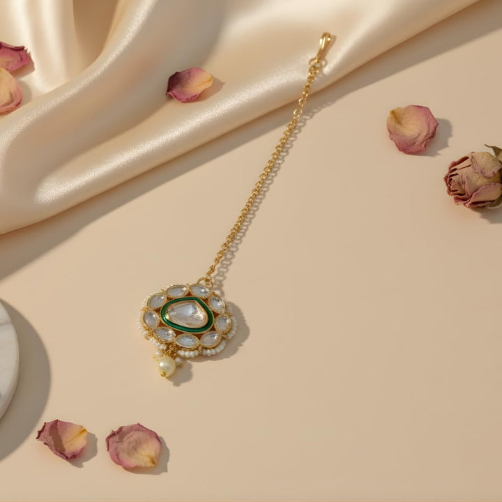 - Classic Kundan Craftsmanship: Beautiful round maang tikka with premium kundan stones, green enamel and pearl drop for an elegant ethnic appeal.