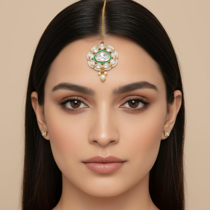 Gold Plated Kundan Maang Tikka for Women & Girls with Pearl Drop | Green Enamel Traditional Bridal & Festive Hair Accessory