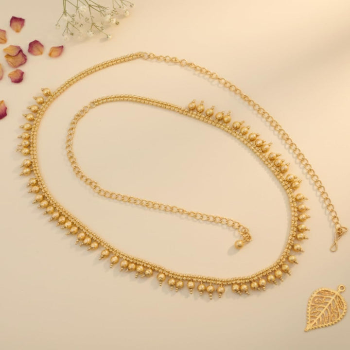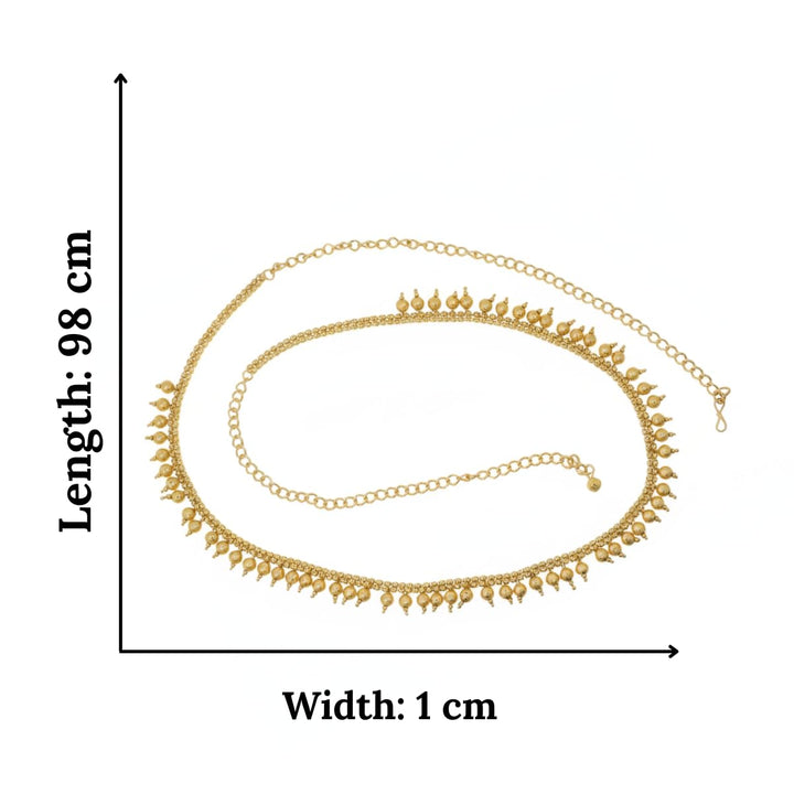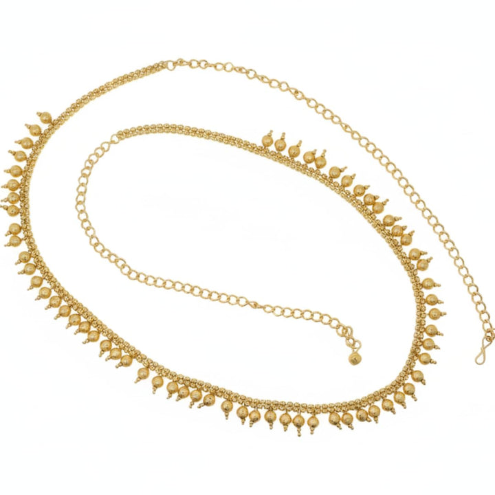 Enhance your traditional attire with this beautifully crafted Gold Plated Pearl Kamarbandh, designed to add grace, charm and a touch of royalty to your festive and bridal look. This waist chain features delicate pearl drops along with a finely crafted gold-plated chain, making it a versatile accessory that complements sarees, lehengas, gowns, shararas and Indo-fusion outfits.The adjustable length ensures a comfortable and secure fit for all body types, while the lightweight design allows long-hour wear without discomfort. Ideal for weddings, festive celebrations, cultural events and photoshoots, this elegant kamarbandh instantly elevates your ethnic styling. A perfect accessory for brides, bridesmaids and anyone who loves timeless traditional jewellery.