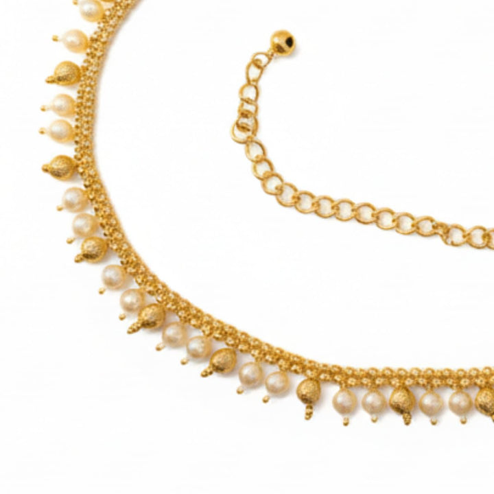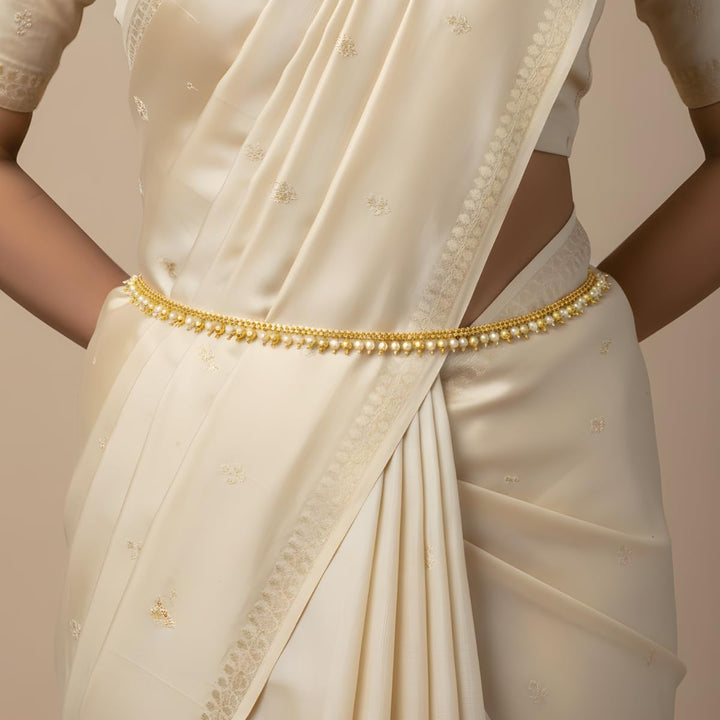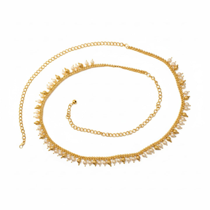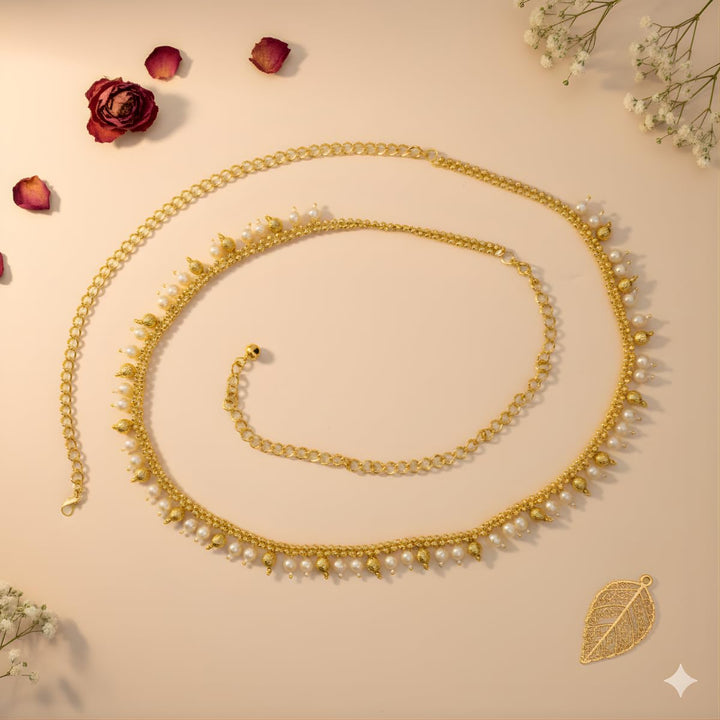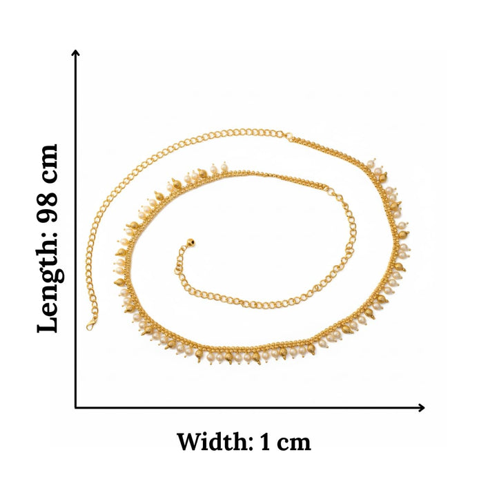 Add a touch of elegance and traditional charm to your festive look with this beautifully crafted Gold Plated Pearl Kamarbandh. Designed with delicate pearl drops and leaf-shaped motifs, this waist chain enhances the beauty of your sarees, lehengas, gowns, and bridal outfits effortlessly. The premium gold plating paired with intricate detailing gives it a rich and royal appeal, making it a perfect accessory for weddings, festivals, and cultural occasions.The kamarbandh is lightweight and comfortable, featuring an adjustable chain to fit all waist sizes securely. It drapes beautifully and stays in place, making it suitable for long-hour wear during celebrations and photoshoots. A versatile and graceful accessory for brides, bridesmaids, dancers, and ethnic fashion lovers—and an ideal gift choice for any festive wardrobe.