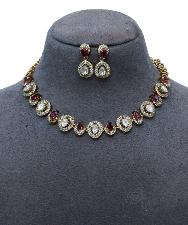Elevate your special occasion look with this exquisite gold-plated bridal necklace set, featuring dazzling teardrop-shaped zirconia and rich ruby-colored stones. Each gem is framed by a halo of shimmering crystals, creating a luxurious, radiant effect that catches the light from every angle. The matching drop earrings complete the set, delivering an effortlessly coordinated, statement-making style. Whether you’re celebrating a wedding, engagement, or festive event, this classic design adds an opulent touch to your ensemble and will be cherished for years to come.