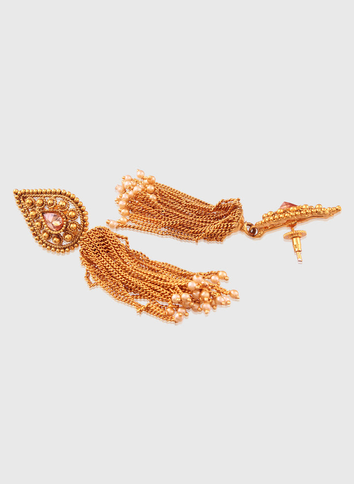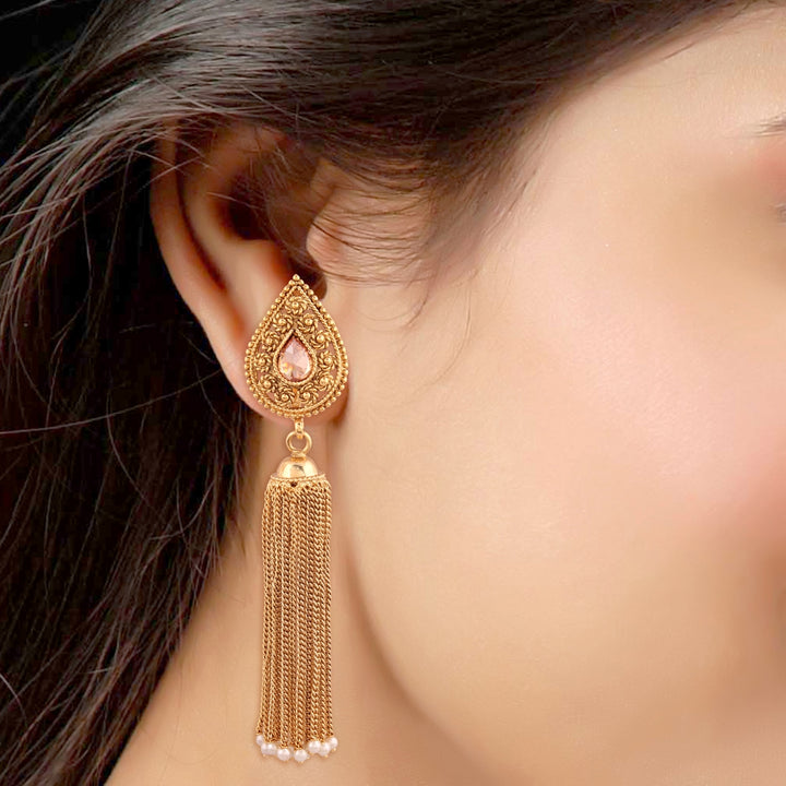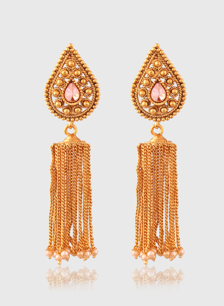 Elevate your ensemble with these sophisticated gold-plated tassel earrings. Featuring an ornate teardrop top embellished with a subtle pink stone, each earring cascades into long, chain-link tassels beautifully finished with dainty pearl beads. The fusion of intricate filigree work and modern tassel design makes these earrings ideal for weddings, festive celebrations, or any occasion where you want to stand out in style. Lightweight yet eye-catching, they effortlessly blend traditional allure with contemporary flair.
