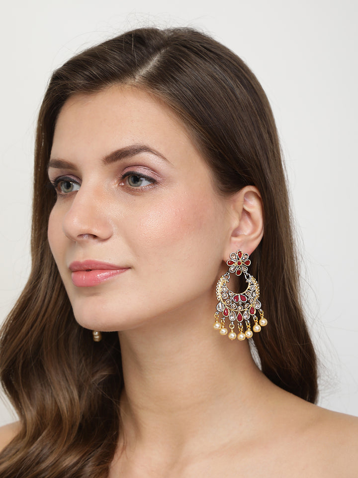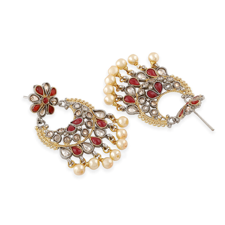 Elevate your look with these captivating chandelier earrings that effortlessly blend intricate floral motifs and vibrant red teardrop accents. Crafted with a dual gold and silver-tone finish, each half-hoop design is studded with sparkling stones and finished with dangling faux pearls for a luxurious, eye-catching sway. Whether you’re dressing for a wedding, festive celebration, or a glamorous evening out, these earrings offer a perfect fusion of tradition and modern flair.