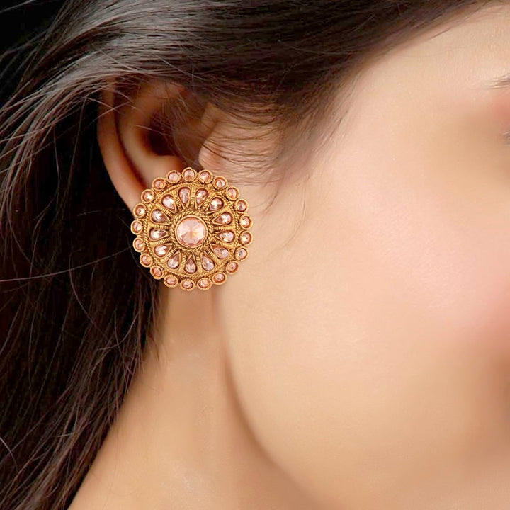 Embrace old-world glamour with these captivating gold-tone round stud earrings. A faceted blush crystal at the center is framed by intricate rope detailing and surrounded by tear-shaped crystals, creating a floral-inspired design that sparkles from every angle. Whether you’re looking to add a touch of vintage charm to an everyday outfit or enhance your formal ensemble, these statement studs are sure to turn heads and make you shine.