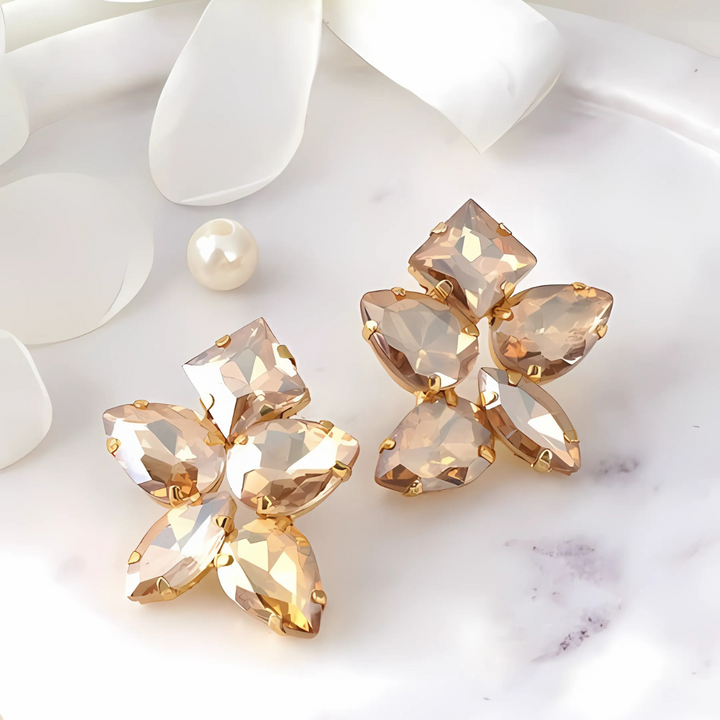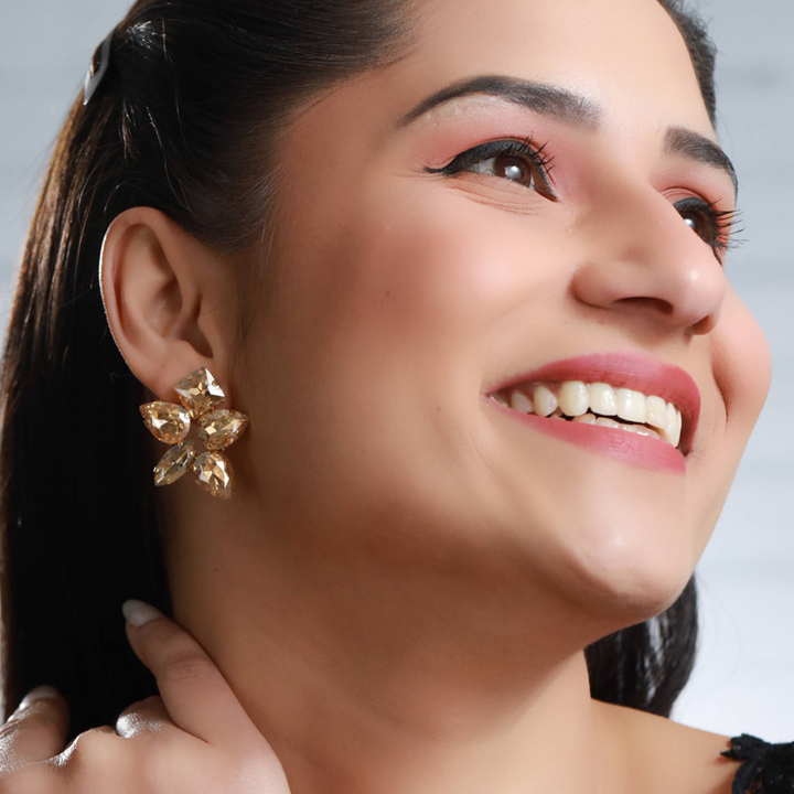 Add a touch of luxury to your wardrobe with these Golden Floral Crystal Stud Earrings. Designed in a beautiful floral pattern, each petal is adorned with golden-toned crystals that catch the light from every angle. These statement studs are perfect for those who love bold, glamorous accessories. Whether paired with evening wear or to elevate your daily look, these earrings provide an exquisite blend of elegance and sophistication.