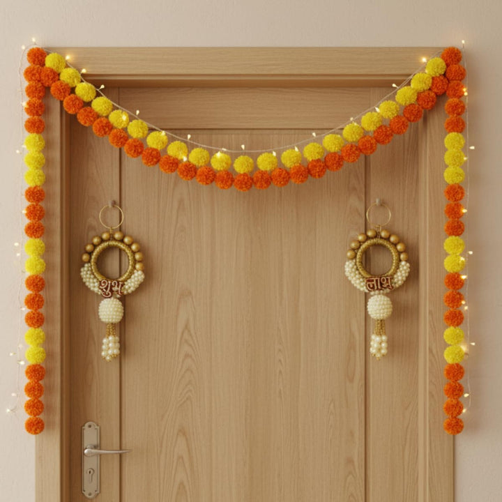 Enhance your festive décor with this elegant Golden & Pearl Shubh Labh Toran, designed to bring prosperity and positivity into your home. Crafted with golden beads, pearl accents, and intricate detailing, this wall hanging features the sacred “Shubh” and “Labh” inscriptions symbolizing good fortune and success. Finished with handcrafted pearl tassels, it exudes charm and tradition, making it perfect for Diwali, Navratri, Ganesh Chaturthi, weddings, and housewarming ceremonies. Its compact yet attractive design makes it ideal for adorning doors, pooja rooms, mandirs, or living room walls, while being lightweight and easy to hang. Made with durable materials, it can be reused for multiple festive seasons, ensuring long-lasting beauty and elegance. A meaningful addition to your home décor, this Shubh Labh toran also makes a thoughtful gift for loved ones, blending traditional craftsmanship with timeless appeal.