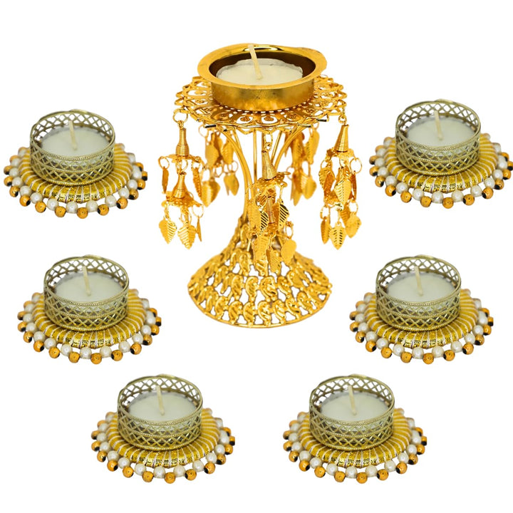 Golden Stand Candle Holder with 6 Gold & White Pearl Bangle Tea Light Holders | Decorative Festival Tealight Set for Diwali, Pooja & Home Décor