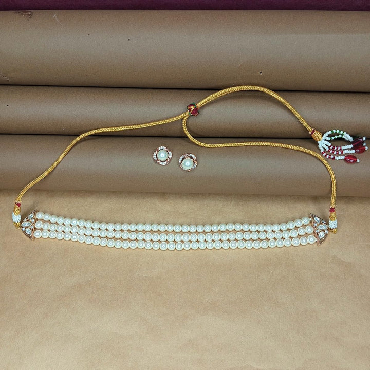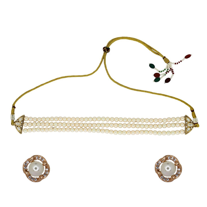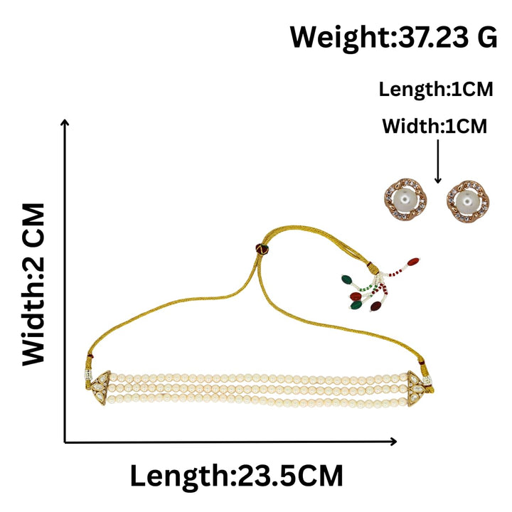 Iksava 3-Layer Pearl Choker Necklace with Kundan Side Caps & Matching Stud Earrings for Women – Bridal, Festive & Traditional Jewelry Set