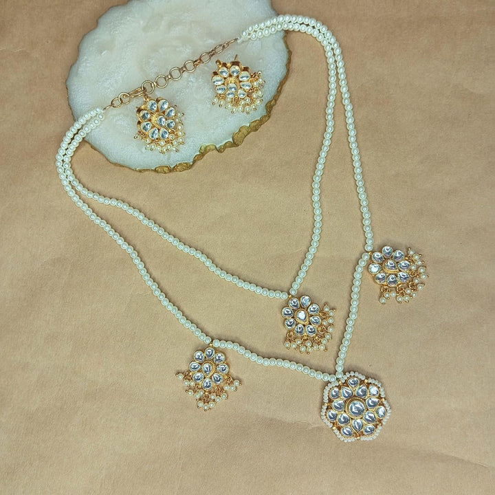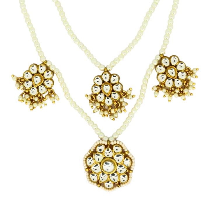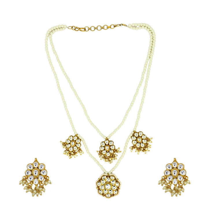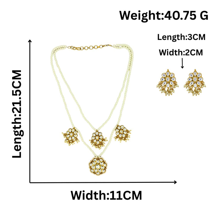 Iksava Premium Double Layer Pearl Necklace and Earrings Set with Jadau Kundan Pendant for Women