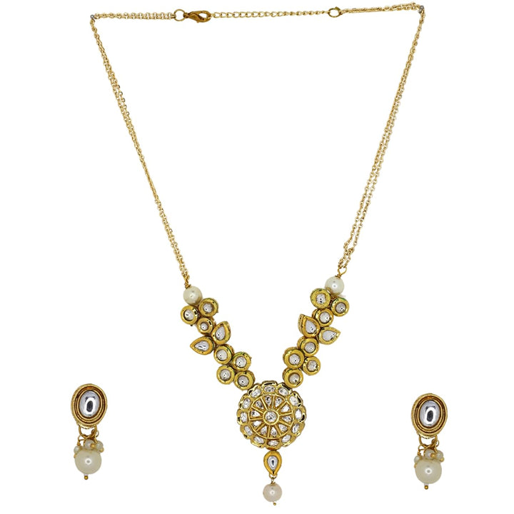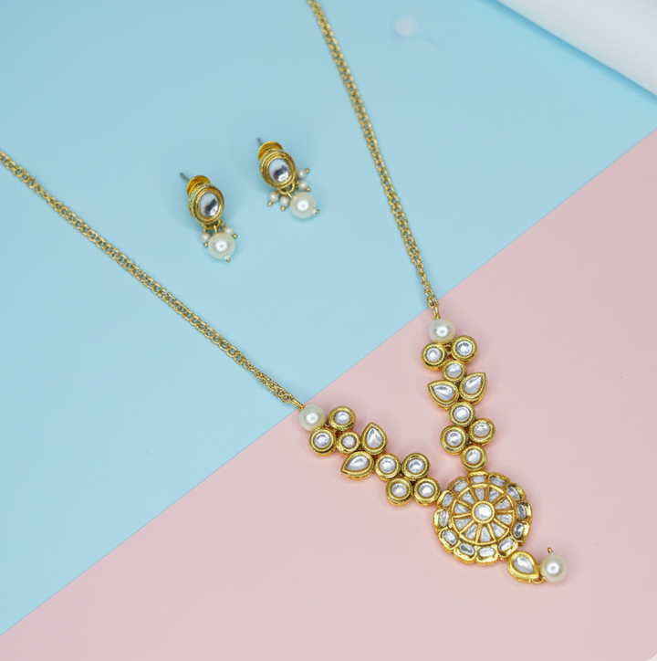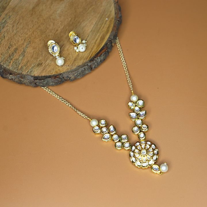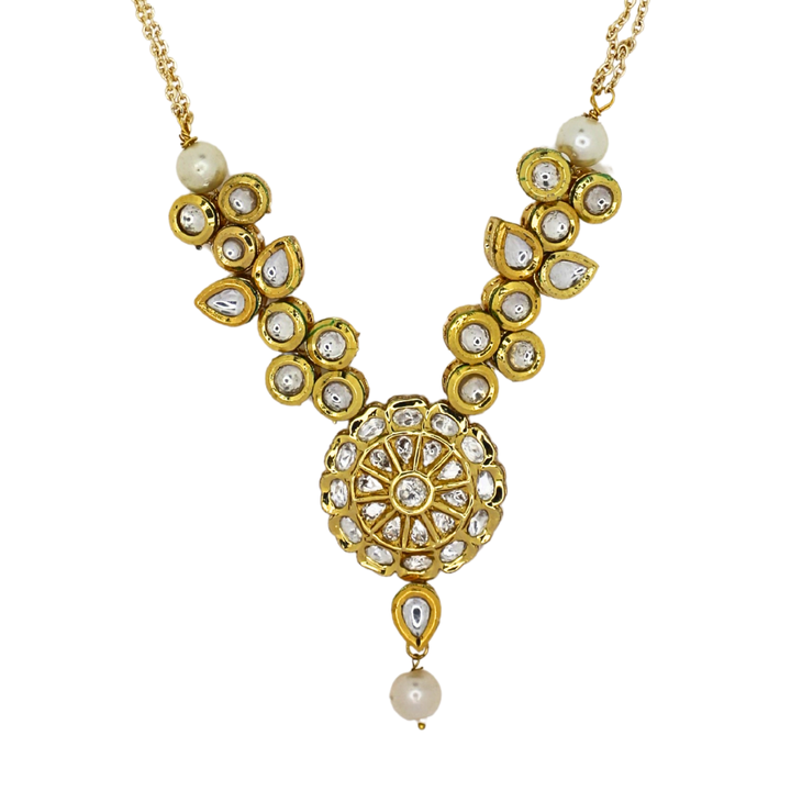 - Regal Design: Gold-tone Kundan necklace with pearl accents and a floral pendant centerpiece