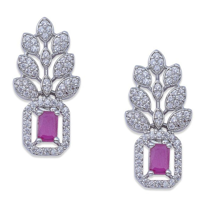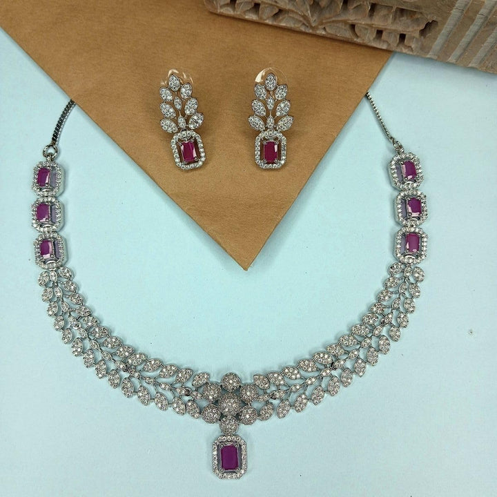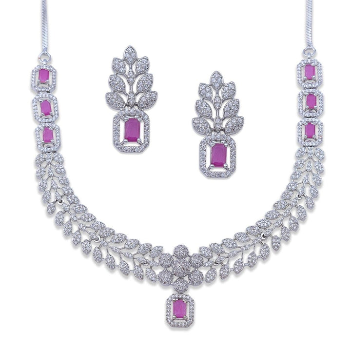 Iksava Silver Plated Pink Ruby & American Diamonds Studded Delicate Necklace Set with Earrings for Womens
