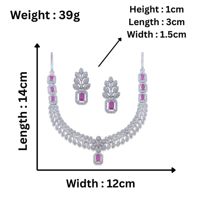 - Stunning Pink Ruby stones with sparkling American Diamonds (CZ) crafted into a luxurious necklace set with matching earrings. Length: 14cm | Width: 12cm