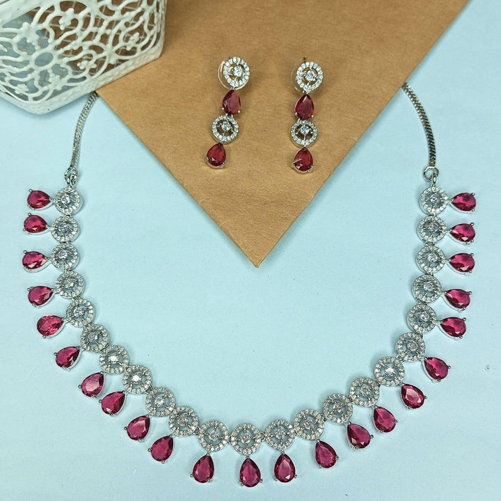 Bring home the charm of royalty with this exquisite Red Ruby Stone and American Diamond Jewellery Set, crafted to make every occasion memorable. Designed with sparkling American Diamonds (CZ) and deep Red ruby stones, this necklace set offers the brilliance of real diamonds combined with the rich elegance of rubies, giving you a luxurious look at an affordable price. The premium plating ensures long-lasting shine, while the lightweight and skin-friendly finish makes it comfortable to wear all day long. Perfect for brides, bridesmaids, and women who love timeless elegance, this set is ideal for weddings, festive celebrations, anniversaries, or grand parties. Pair it with traditional outfits like sarees, lehengas, and salwar suits to create a regal ethnic look, or style it with gowns and Indo-western attire for a graceful modern statement. This jewellery set is not just a fashion accessory but also a thoughtful gift choice for loved ones on special occasions. Its combination of classic ruby stones and dazzling American Diamonds ensures it stands out, making you the center of attention wherever you go. Easy to maintain and beautifully designed, this necklace set with matching earrings is a must-have in every woman’s jewellery collection. Looking for the perfect gift? This American Diamond Jewelry Set is ideal for birthdays, anniversaries, weddings, festivals, and special occasions. Every woman deserves to shine, and this sparkling set is the ultimate way to make her feel truly special.