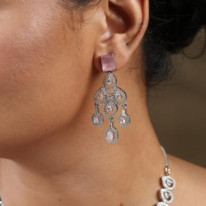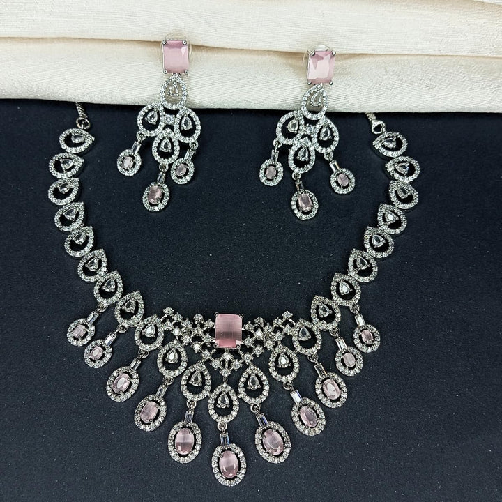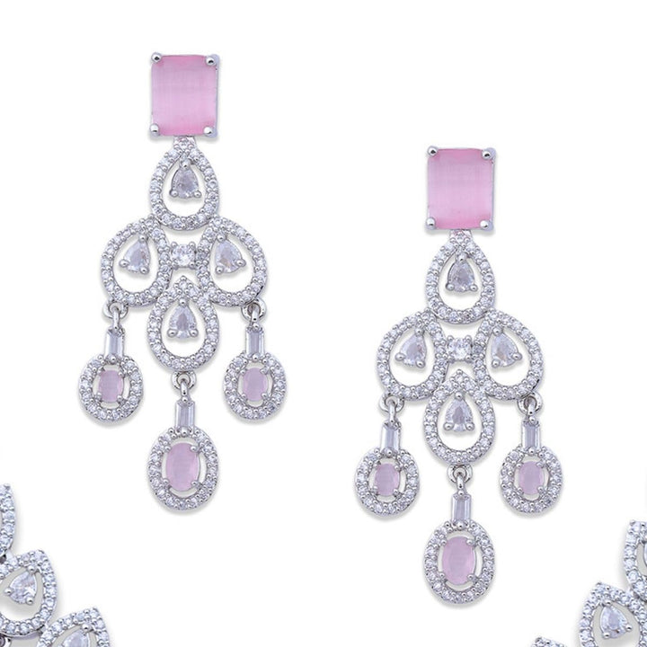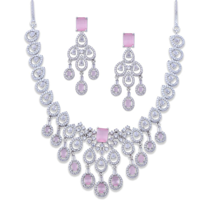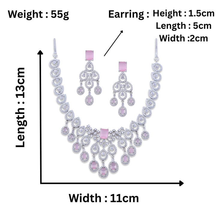 - Beautifully crafted rhodium plated necklace set with pastel pink stones, paired with matching earrings, designed to add a touch of sophistication to every occasion. Length: 12cm | Width: 12cm