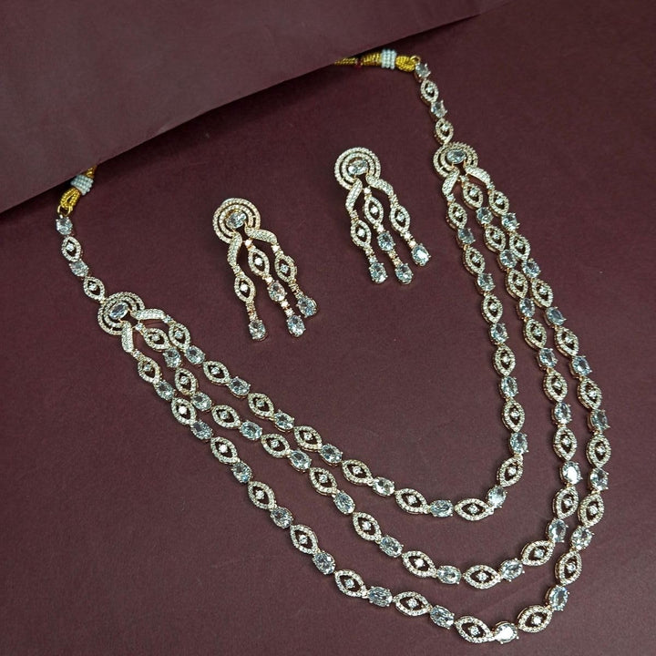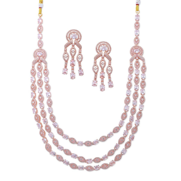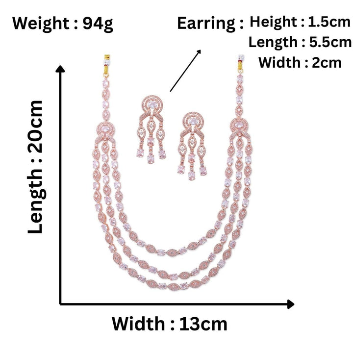 Add a modern and chic touch to your style with this elegant Rose Gold Layered Necklace Set, crafted for women who love trendy yet timeless jewellery. Designed with multiple layers of delicate rose gold plated chains and paired with matching earrings, this necklace set is perfect for both casual wear and special occasions. The rose gold plating gives it a soft, feminine charm that stands out while maintaining a classy, minimal look. Lightweight, durable, and skin-friendly, this set is comfortable to wear all day without any irritation. Whether you are dressing up for a wedding, party, office event, or casual outing, this layered necklace set is a versatile accessory that instantly elevates your look. It pairs beautifully with dresses, gowns, tops, sarees, and Indo-western outfits, making it a must-have in every woman’s collection. Its layered design adds elegance without being heavy, making it suitable for daily wear as well as festive occasions. This Rose Gold Layered Necklace Set also makes a wonderful gift for your loved ones on birthdays, anniversaries, Valentine’s Day, weddings, or festive celebrations. Easy to maintain and store, it brings together modern fashion and everyday elegance. With its stylish layered design and soft rose gold finish, this jewellery set is a timeless piece that completes every outfit. This American Diamond Jewelry Set is ideal for birthdays, anniversaries, weddings, festivals, and special occasions. Every woman deserves to shine, and this sparkling set is the ultimate way to make her feel truly special.