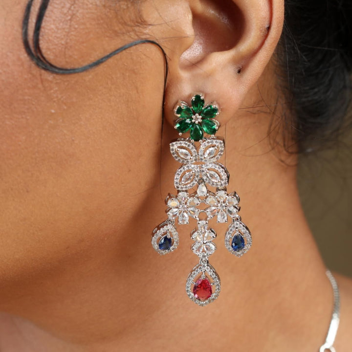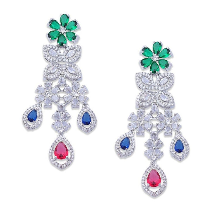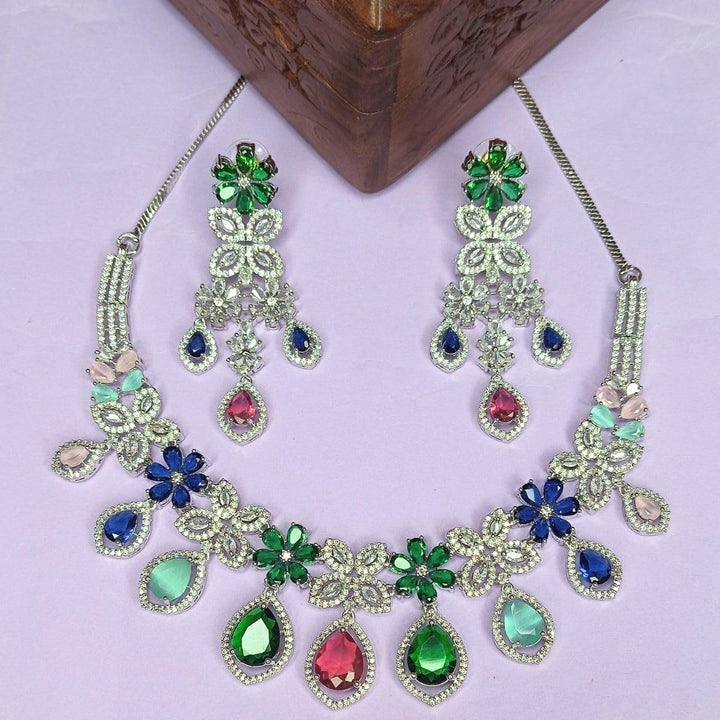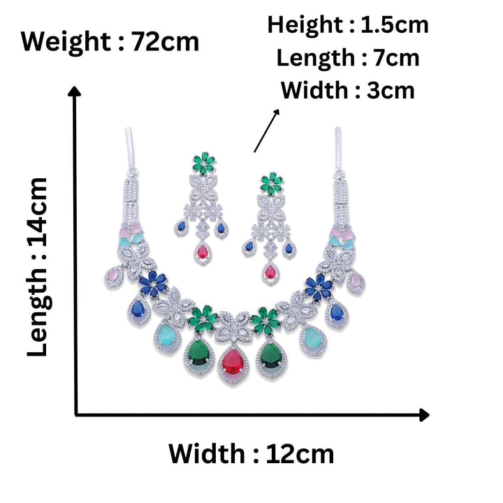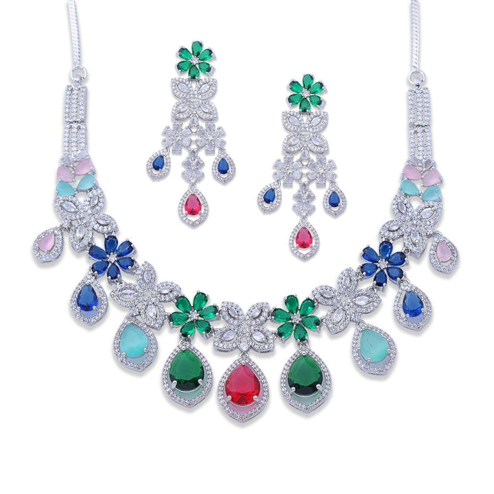Iksava Silver Plated Floral Design American Diamonds Studded Multicolour/Navratna Necklace Set for Women