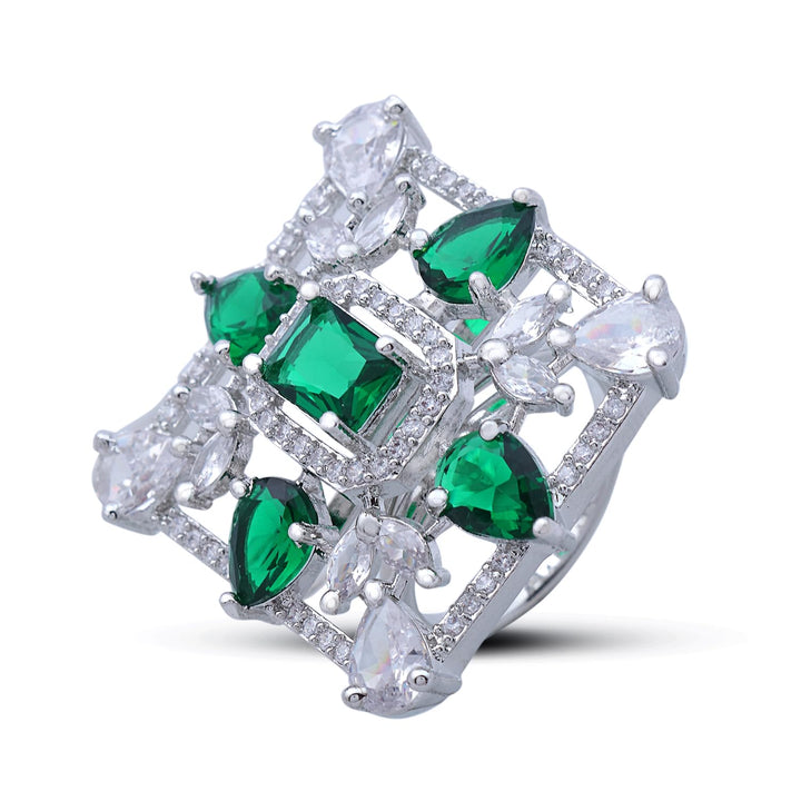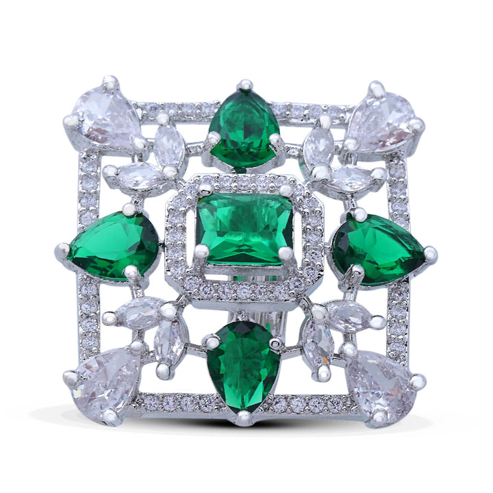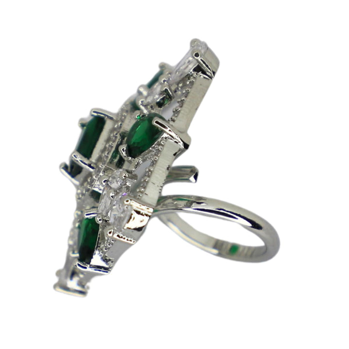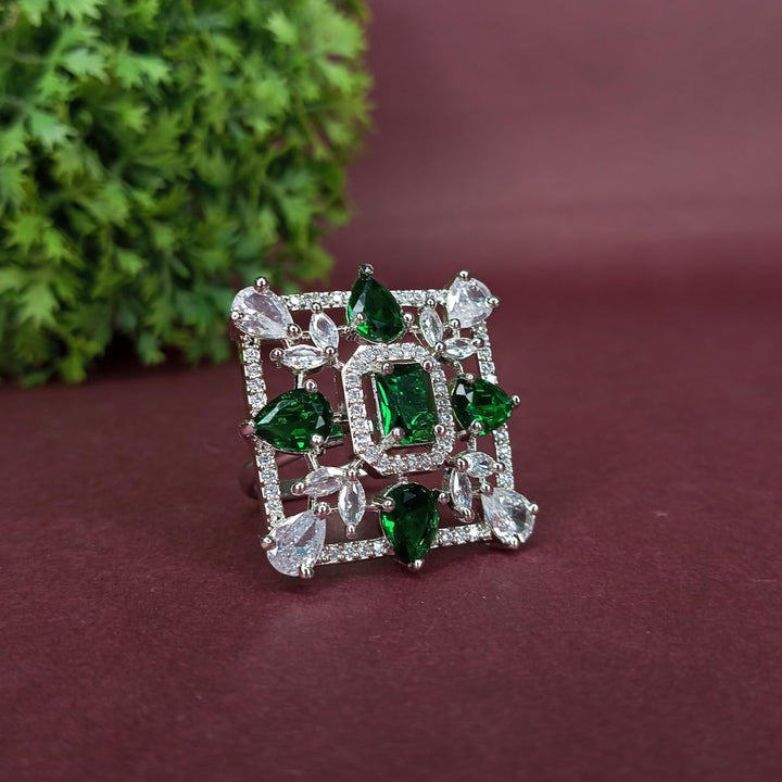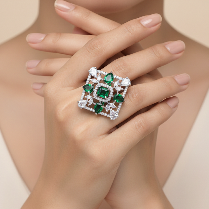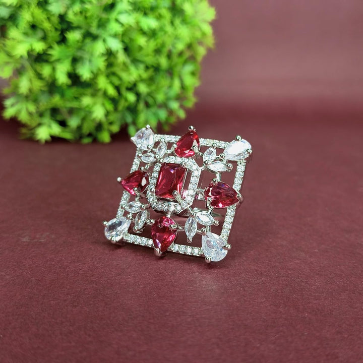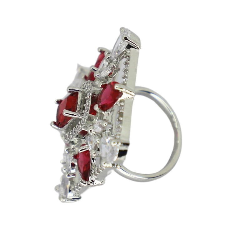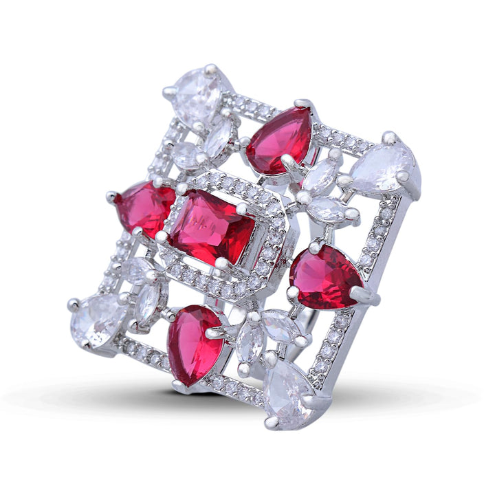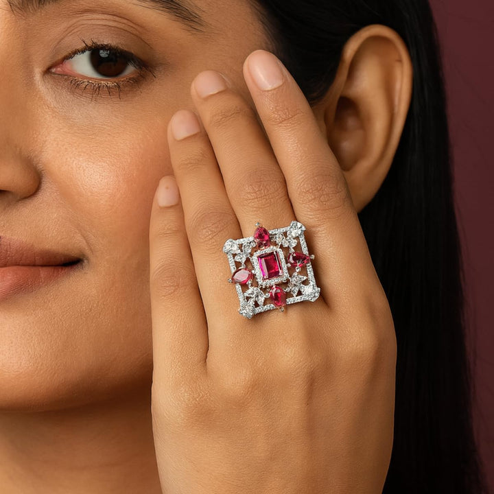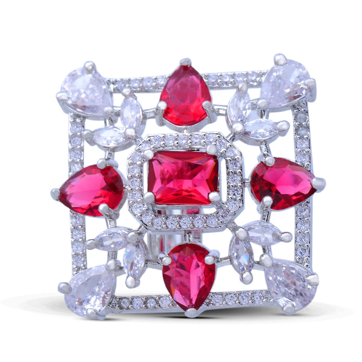 Elevate your style with this luxurious red ruby-inspired cocktail ring from Trendisia. Designed with a striking square silhouette, the ring features a radiant red emerald-cut centerpiece surrounded by sparkling teardrop and marquise CZ diamonds that enhance its brilliance. The high-quality silver-tone base adds durability and shine, making this an ideal accessory for weddings, cocktail parties, festive occasions, or evening celebrations. Its adjustable band ensures a secure and comfortable fit for all finger sizes, eliminating sizing worries. A perfect blend of elegance and boldness, this statement finger ring complements both ethnic ensembles and contemporary outfits. Whether youβre gifting it for birthdays, anniversaries, or bridal showers, or adding it to your own jewelry collection, this ring promises sophistication, glamour, and timeless charm.