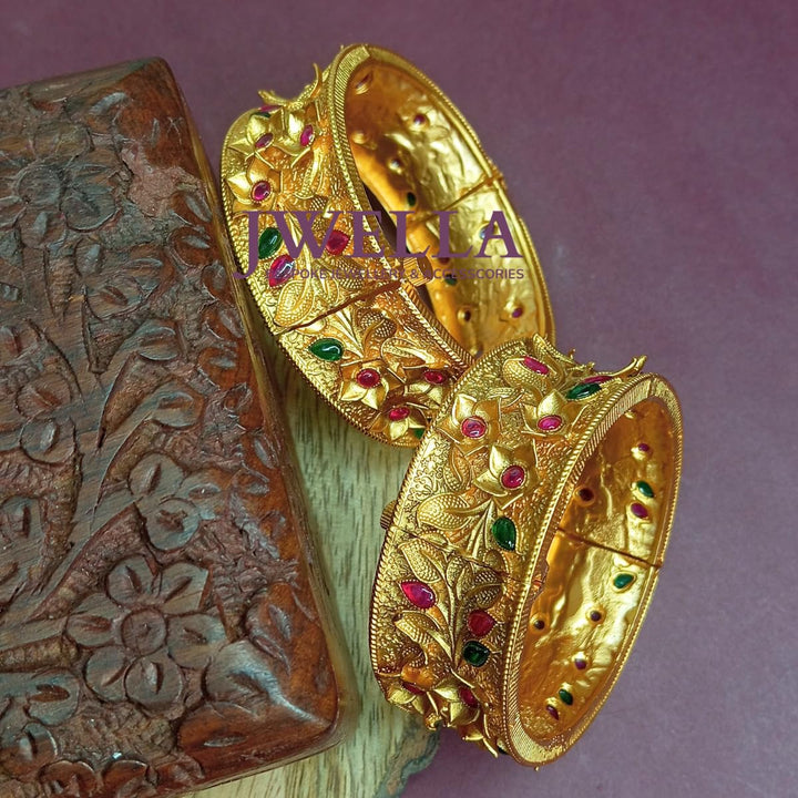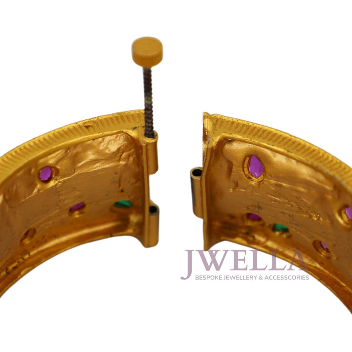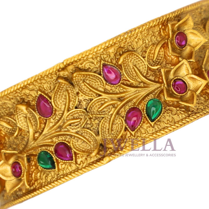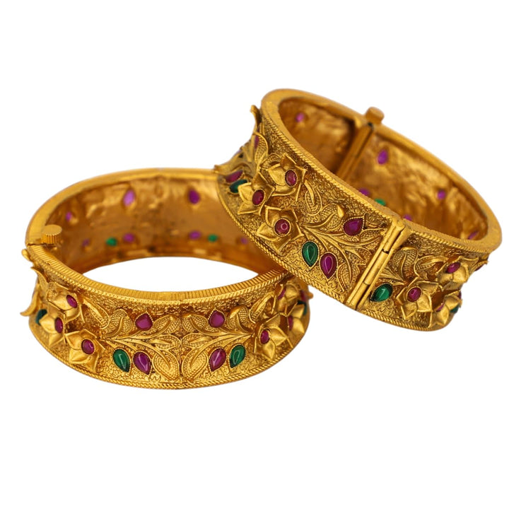 Celebrate timeless tradition with these wide antique gold-plated bangles, intricately designed with floral and vine-inspired motifs and studded with vibrant pink and green teardrop stones. The exquisite detailing and classic design make this kada set perfect for bridal trousseau and ethnic festivities. Crafted from premium-quality alloy and finished with a skin-friendly polish, these bangles are not only visually rich but also comfortable for long wear. Their broad structure adds regal charm to sarees, silk lehengas, or festive Anarkali suits. The vibrant dual-tone stonework complements all traditional outfits, making this pair a standout accessory for weddings, Diwali, Karva Chauth, or temple occasions. A must-have for every jewelry lover, this set also makes a thoughtful and elegant gift.