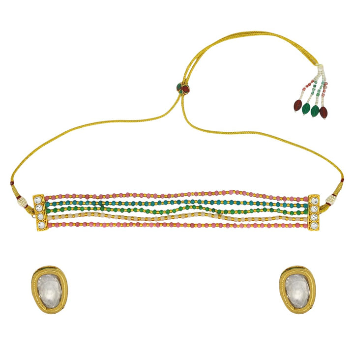 Elevate your ethnic look with this vibrant 5-layer choker necklace, featuring a stunning combination of pink, green, blue, and golden beads. The gold-toned end caps are adorned with sparkling Kundan stones, adding a royal charm to the design. Paired with elegant matching stud earrings, this set is perfect for weddings, festive occasions, and cultural celebrations. Lightweight yet eye-catching, it beautifully complements sarees, lehengas, and Anarkali suits.