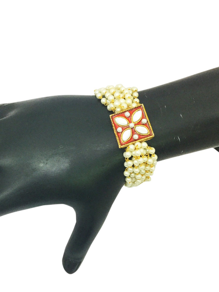 pearl kundan bracelet, red meenakari kada, multi‑strand bridal wristwear, Indian festive jewellery, Trendisia accessories