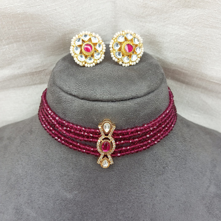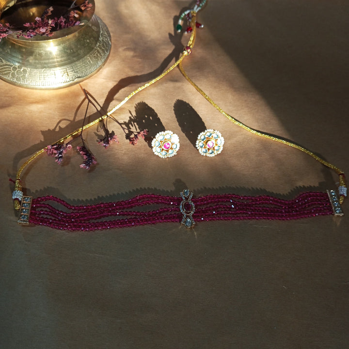 Elevate your festive or wedding look with this exquisite choker necklace set, featuring multiple strands of maroon beads for a rich, regal feel. The gold-tone accents and sparkling stones create a striking focal point, while the matching stud earrings perfectly complement the necklace. An adjustable tie closure ensures a comfortable fit, making this set a stunning addition to your traditional or contemporary attire.