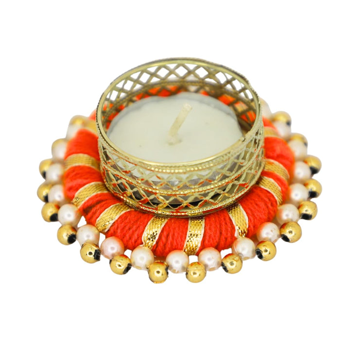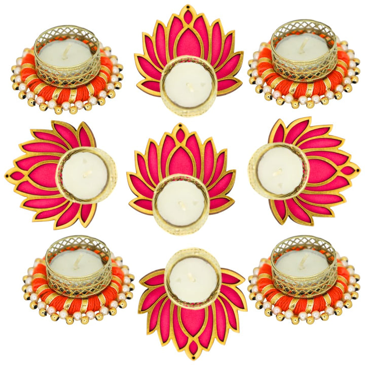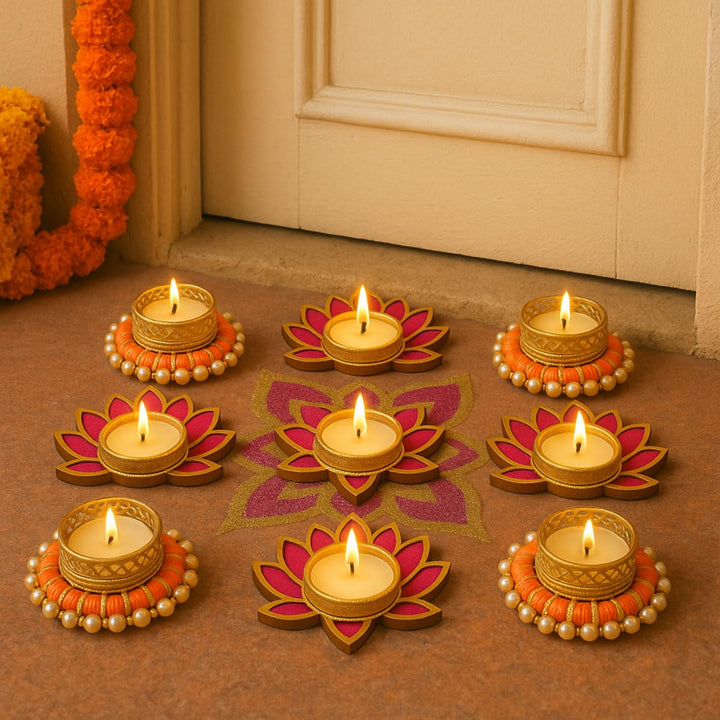 Celebrate the festive season with this combo pack of 9 decorative tealight holders, featuring 4 Orange Bangle with Gold Pearl Holders and 5 Glow Lotus Tealight Holders. Each piece is thoughtfully handcrafted with premium materials, combining traditional charm with elegant detailing. The orange bangle holders are wrapped in golden pearls, creating a rich, luxurious look, while the lotus-shaped tealight holders radiate vibrant festive energy. Together, they bring a warm and inviting glow to your home, making them perfect for Diwali, Navratri, weddings, rangoli decoration, mandir setup, or gifting. Lightweight and reusable, these holders are designed for long-lasting use, ensuring that they remain a cherished part of your festive collection year after year. Add sophistication and brightness to your celebrations with this elegant diya set – a must-have for anyone who loves to decorate their space with a touch of tradition and beauty.