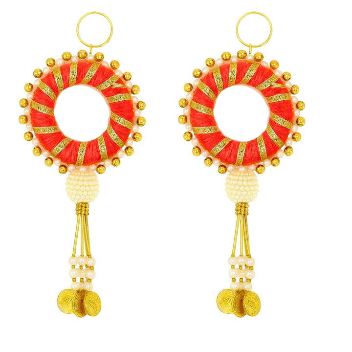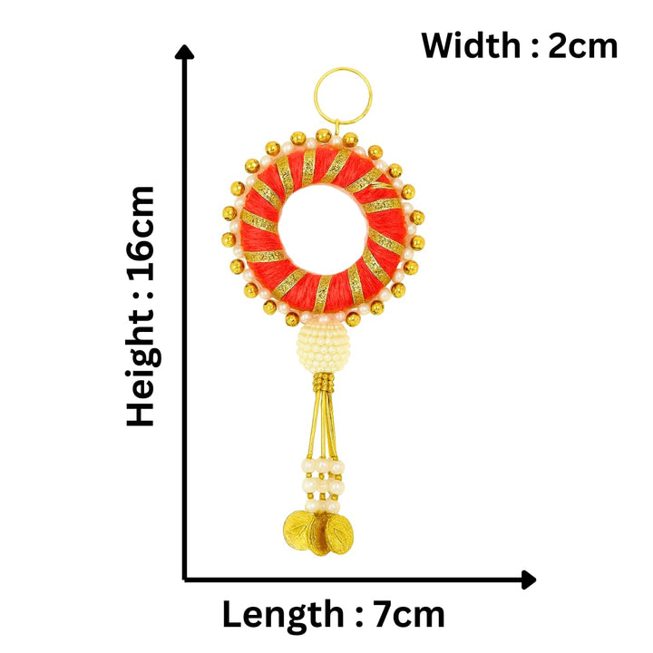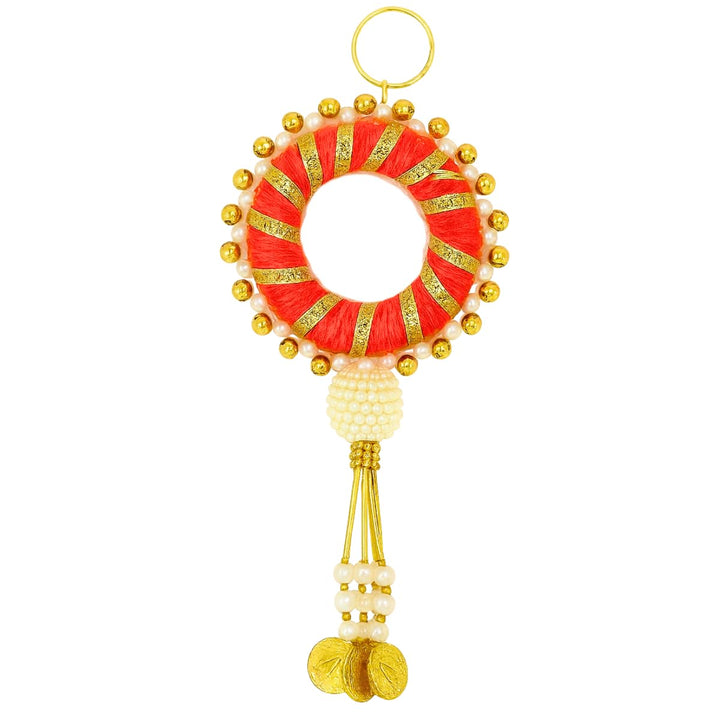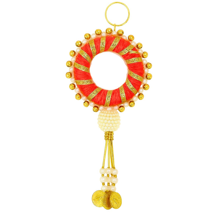 Brighten up your festive celebrations with this Orange & Golden Decorative Toran, designed to add a touch of tradition and elegance to your home. Featuring a circular frame wrapped in vibrant red and golden detailing, it is bordered with golden and pearl beads for a rich, festive look. The toran is finished with handcrafted pearl tassels and golden leaf hangings, symbolizing prosperity and divine blessings. Ideal for adorning main entrances, mandirs, pooja rooms, or living spaces, this toran is a perfect choice for Diwali, Navratri, Ganesh Chaturthi, weddings, and housewarming ceremonies. Lightweight and easy to hang, it is crafted with quality materials ensuring durability and reusability for multiple occasions. Its bright colors and elegant craftsmanship make it not only a beautiful home décor piece but also a thoughtful festive gift for friends and family. Create a warm and auspicious welcome with this traditional wall hanging.