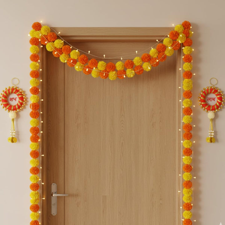 - Vibrant Orange & Golden Design – Traditional festive colors symbolizing energy, joy, and prosperity.Pearl & Golden Bead Detailing – Adds elegance and richness to your home décor.