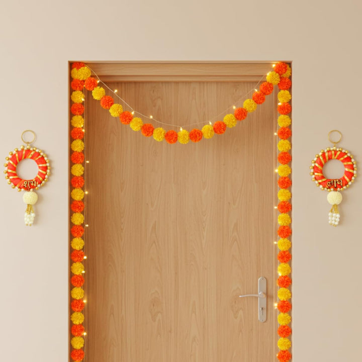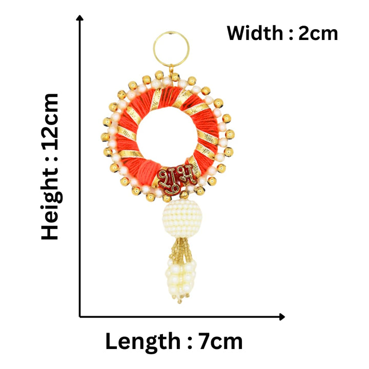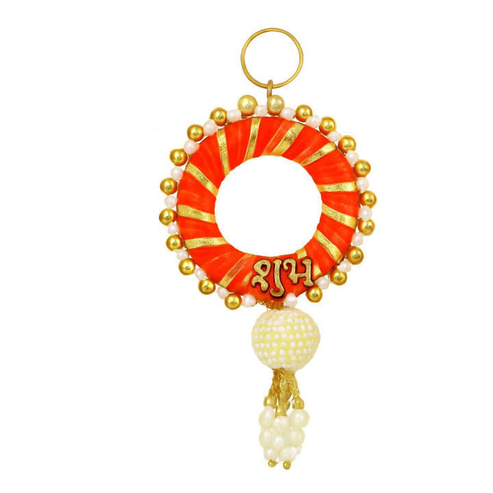Bring auspicious vibes and vibrant energy to your home with this Orange & Golden Shubh Labh Toran. Crafted with a striking circular design wrapped in orange and golden detailing, it is adorned with pearls and features “Shubh” and “Labh” inscriptions symbolizing blessings of prosperity and success. A beautifully handcrafted pearl tassel at the base enhances its charm and adds elegance to your festive décor. Ideal for adorning the main entrance, pooja room, mandir, or living space, this wall hanging is a wonderful way to welcome positivity during Diwali, Navratri, Ganesh Chaturthi, and housewarming ceremonies. Made with durable materials and lightweight for easy hanging, this toran can be reused across multiple festive occasions. Its bright color palette makes it stand out and instantly elevates the festive atmosphere. A thoughtful and meaningful gifting option for family and friends, this toran combines tradition with style.