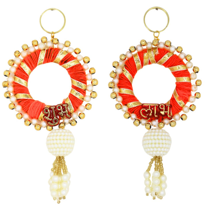 Orange & Golden Shubh Labh Decorative Door Hanging Toran with Pearl Tassels, Traditional Wall Hanging for Diwali & Festive Home Décor