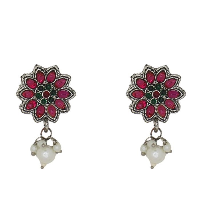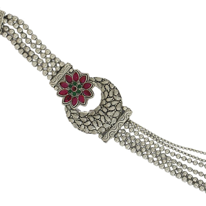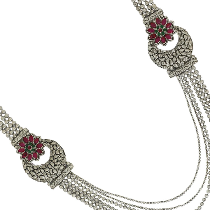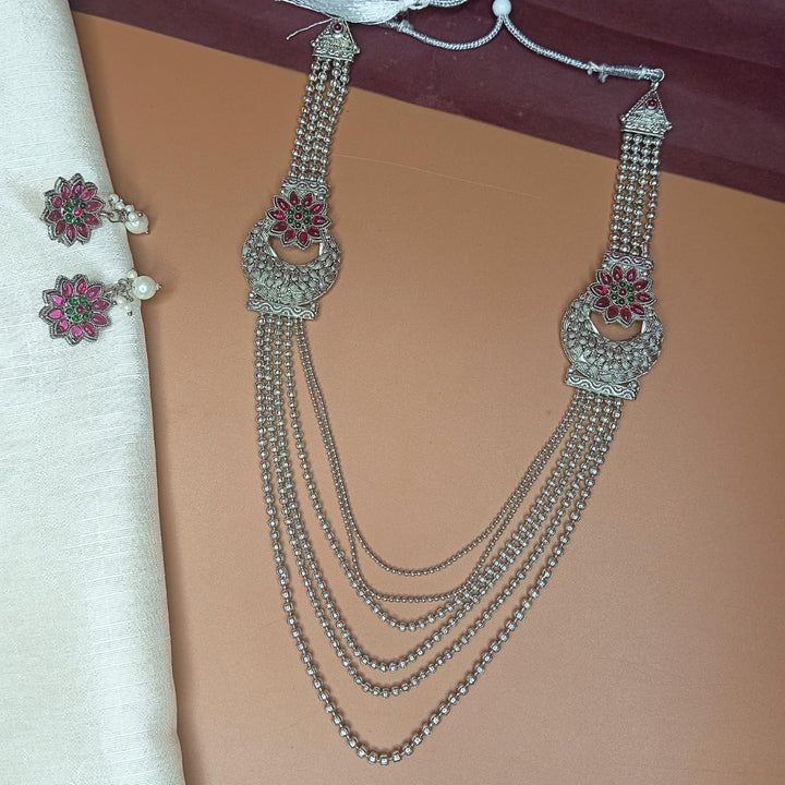 Enhance your ethnic charm with this stunning Oxidised Silver Layered Necklace Set designed with a traditional yet contemporary appeal. The set features a beautifully crafted multi-layered necklace with intricate detailing, floral motifs embellished with ruby-red stones, and matching stud earrings adorned with dangling pearls. Made with premium quality oxidised silver finish, the necklace offers both durability and elegance, making it ideal for weddings, parties, festive occasions, and cultural events. The adjustable dori ensures a comfortable fit for all neck sizes, while the lightweight earrings allow for effortless wear throughout the day. This jewellery set pairs perfectly with sarees, lehengas, kurtis, and Indo-western outfits, adding a regal touch to your ensemble. Whether you are a bride, bridesmaid, or attending a special celebration, this necklace set completes your look with timeless beauty. It also makes a thoughtful gift choice for loved ones during festivals, anniversaries, or special occasions.
